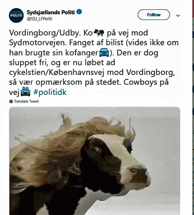 Men en ko kender ikke færdselsreglerne, så pas på derude.
