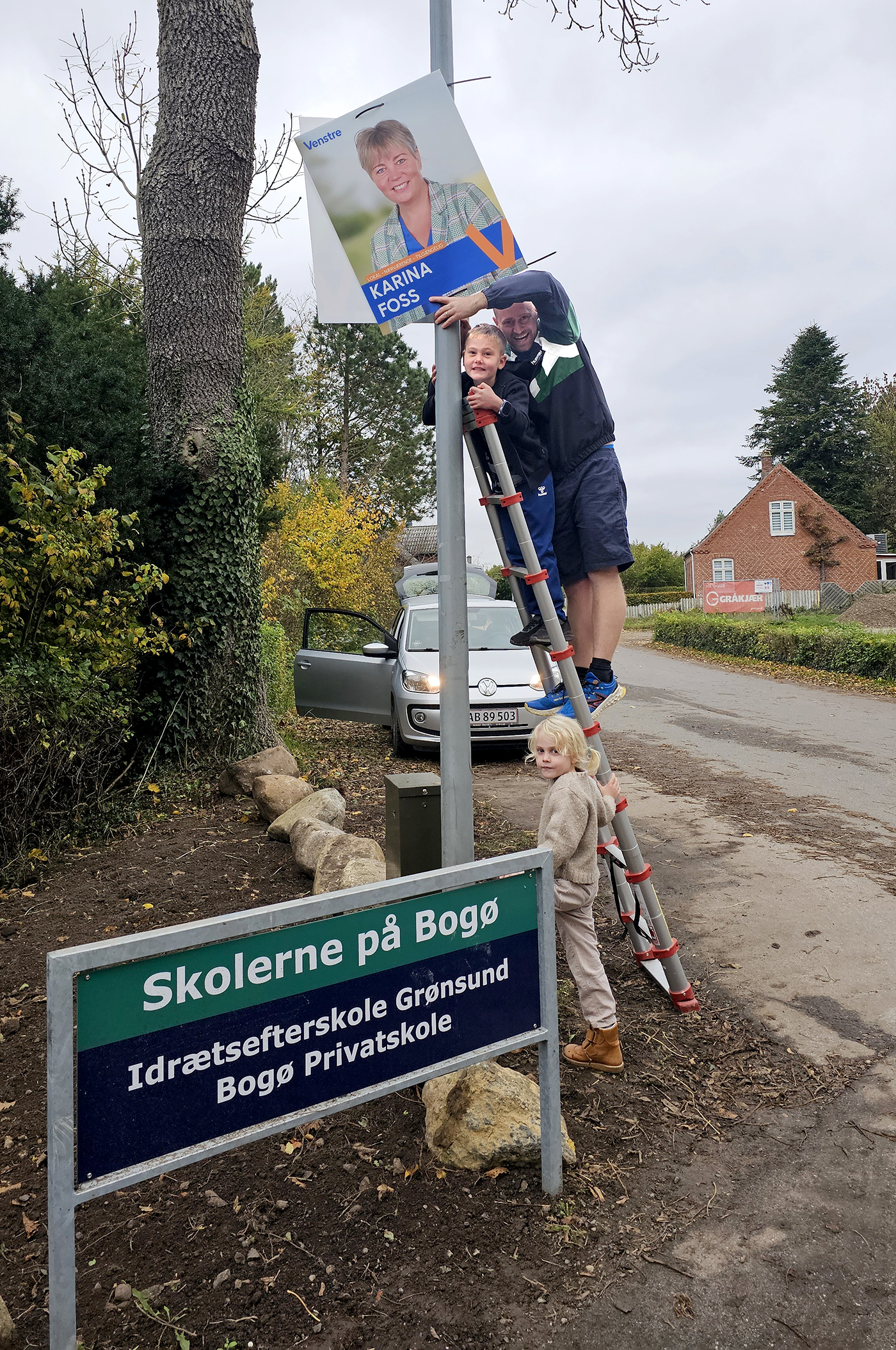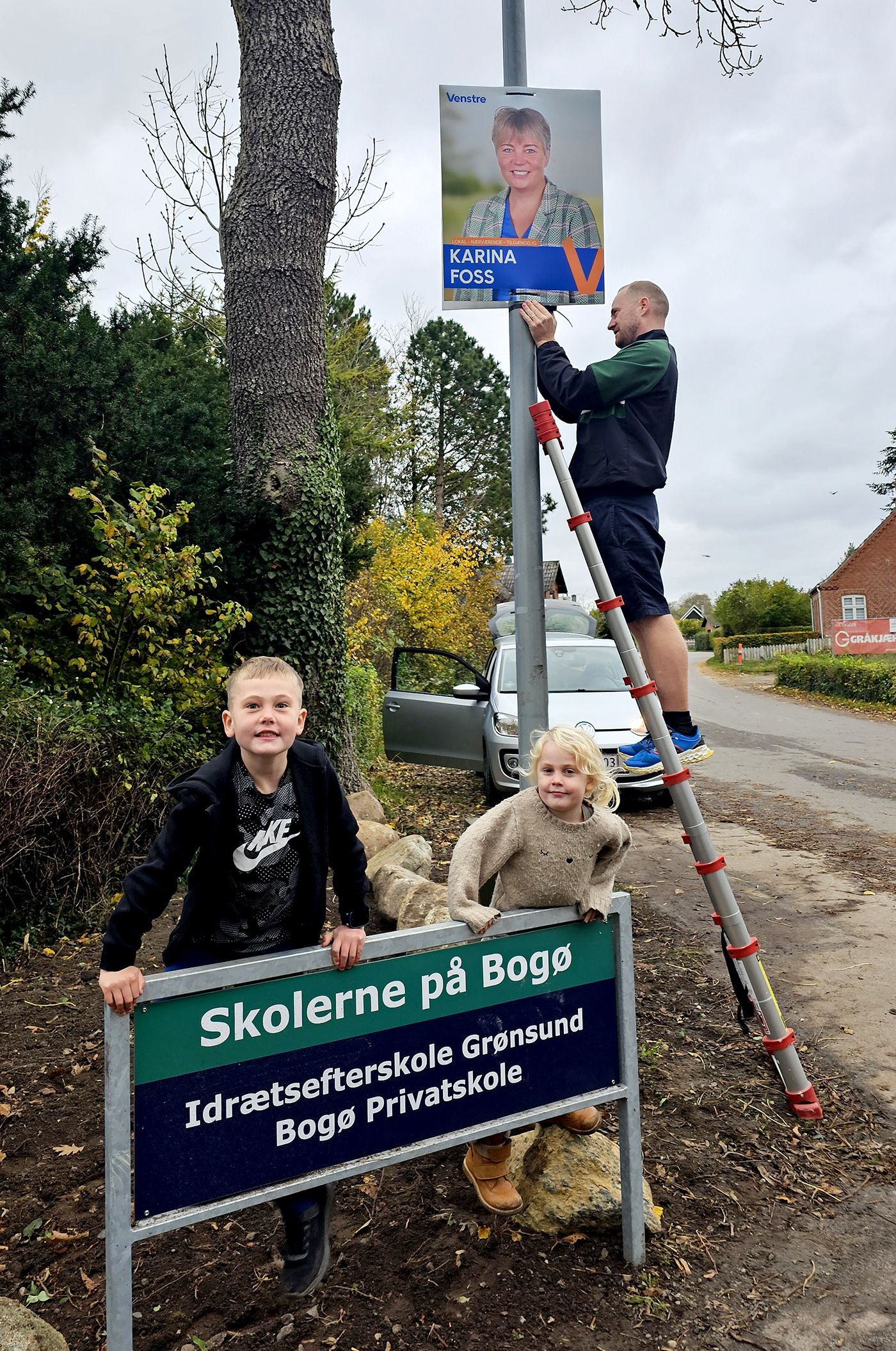 Klokken 12 i dag gik startskuddet til valgkampen op til kommunalvalget 2025 – og det betyder, at der nu igen må sættes valgplakater op rundt omkring i landet. På Bogø var Andreas og hans to børn, Nelly og Hektor, hurtige ude. Klokken 12.01 satte de den allerførste plakat op af svigermor Karina Foss ved Skolerne på Bogø, inden turen gik videre for at hænge flere op.