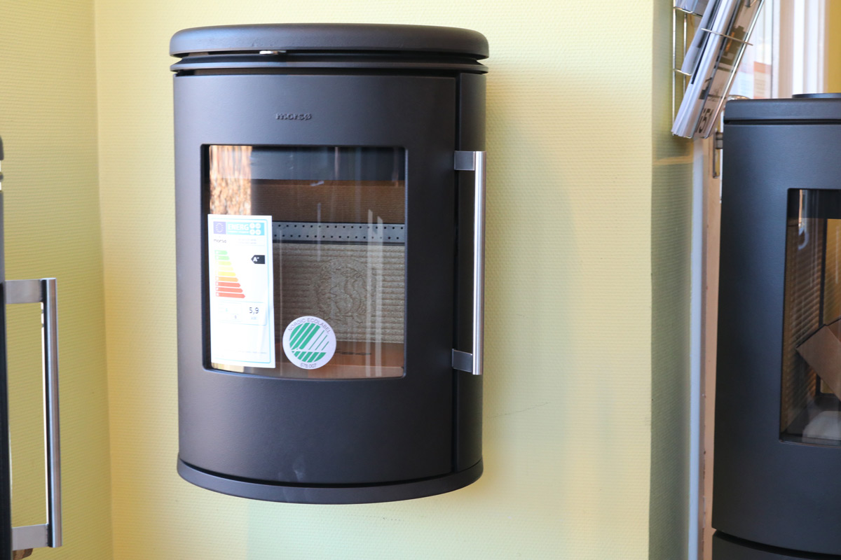 Morsø er også et dansk kvalitetsprodukt. Her en væghængt brændeovn.
