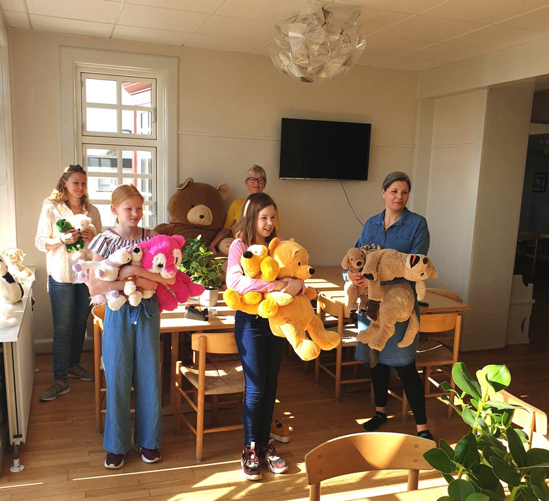 Vi er i fuld gang med at pynte skolen med en masse bamser.
