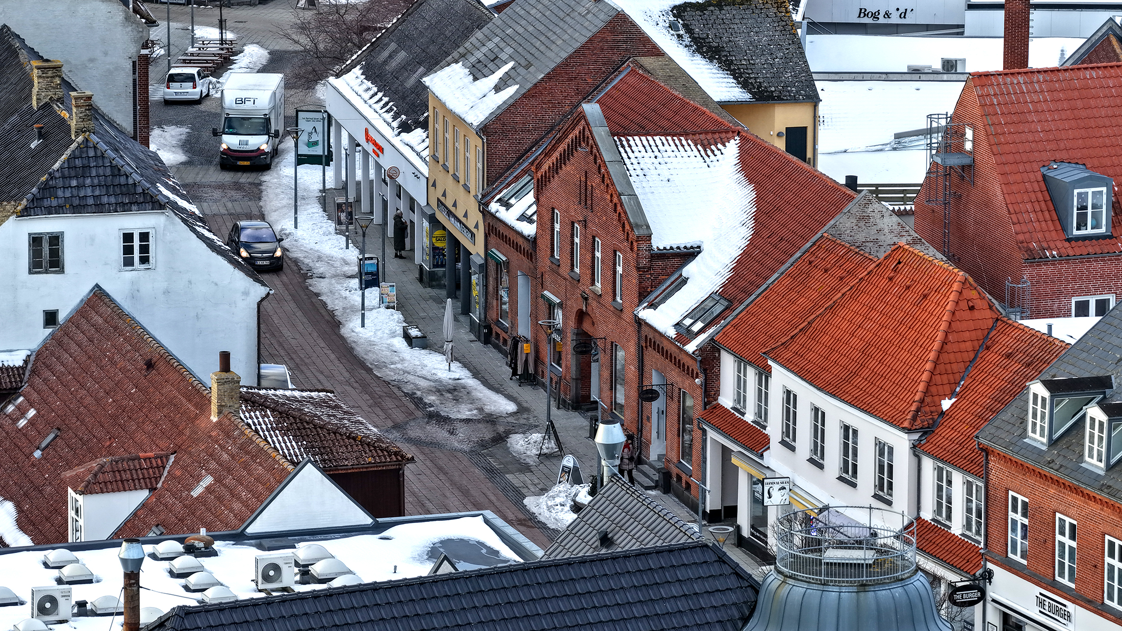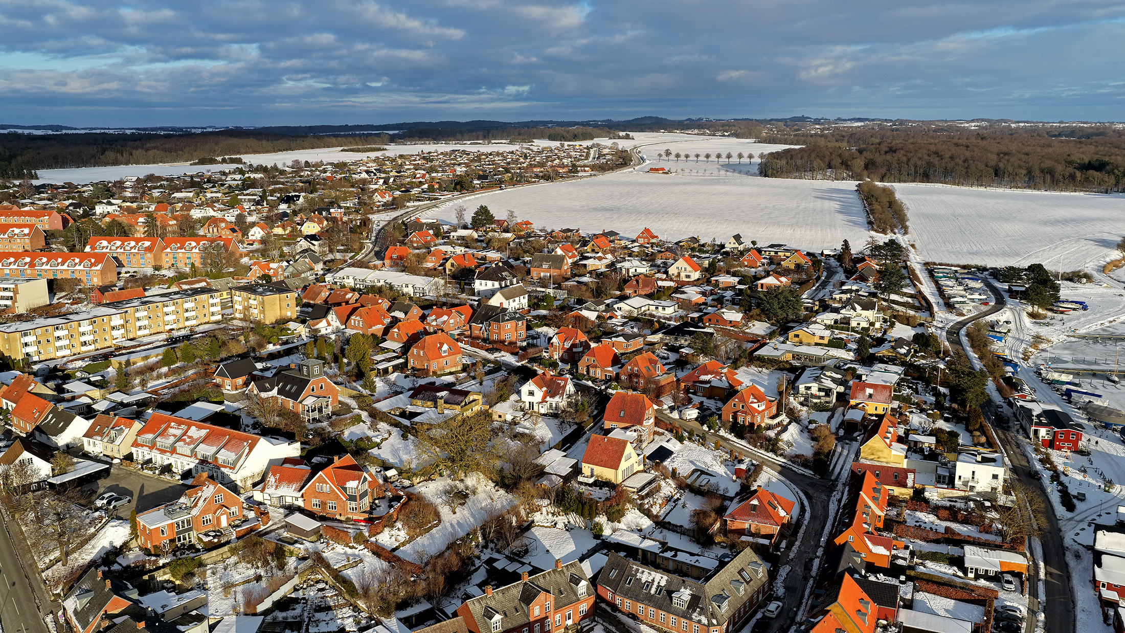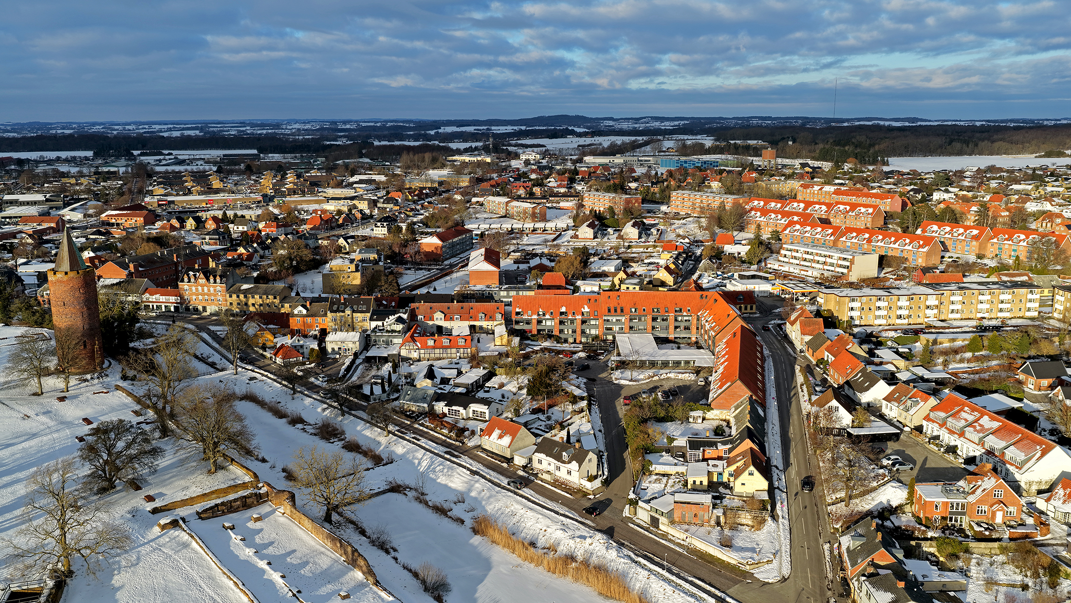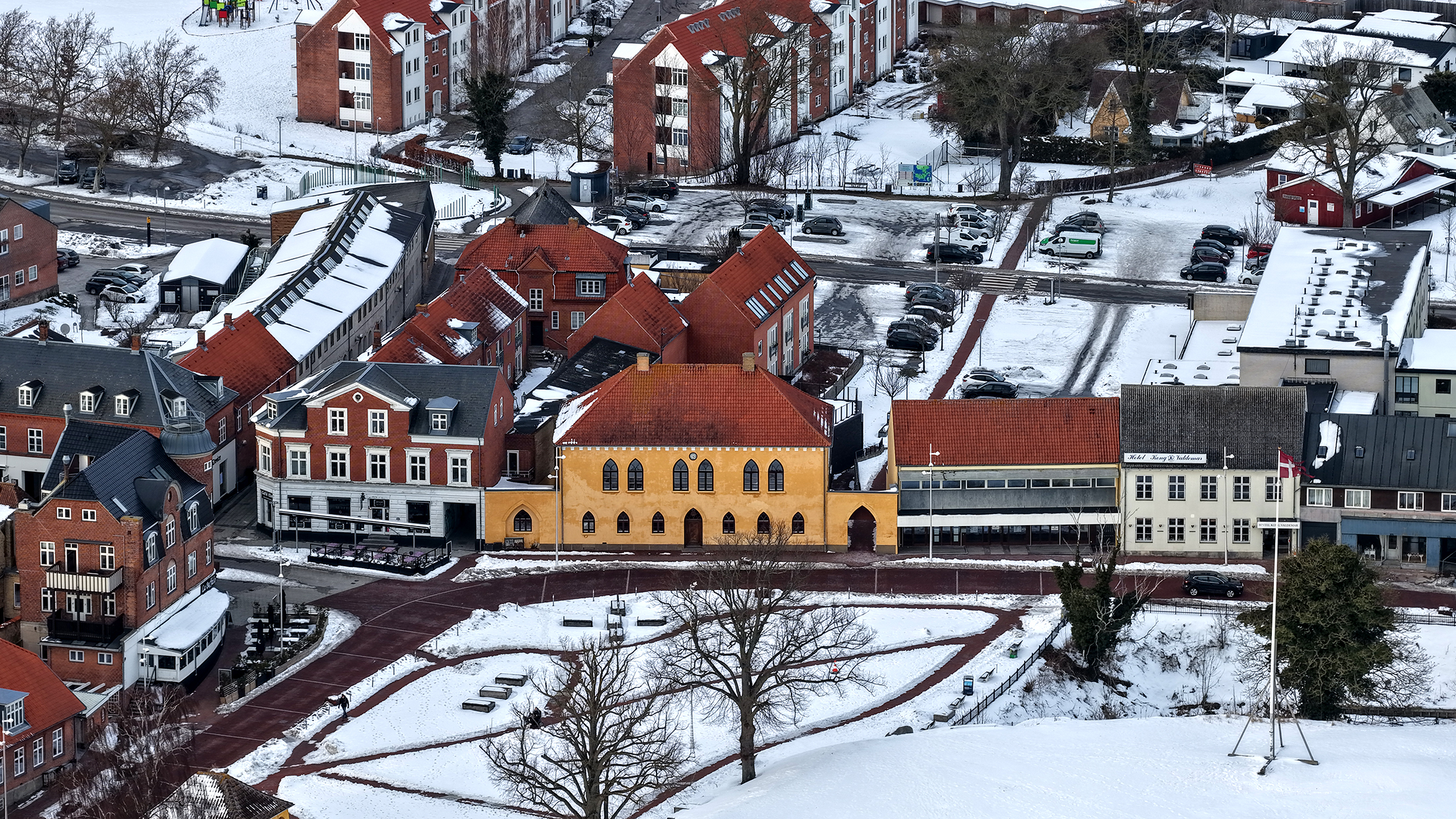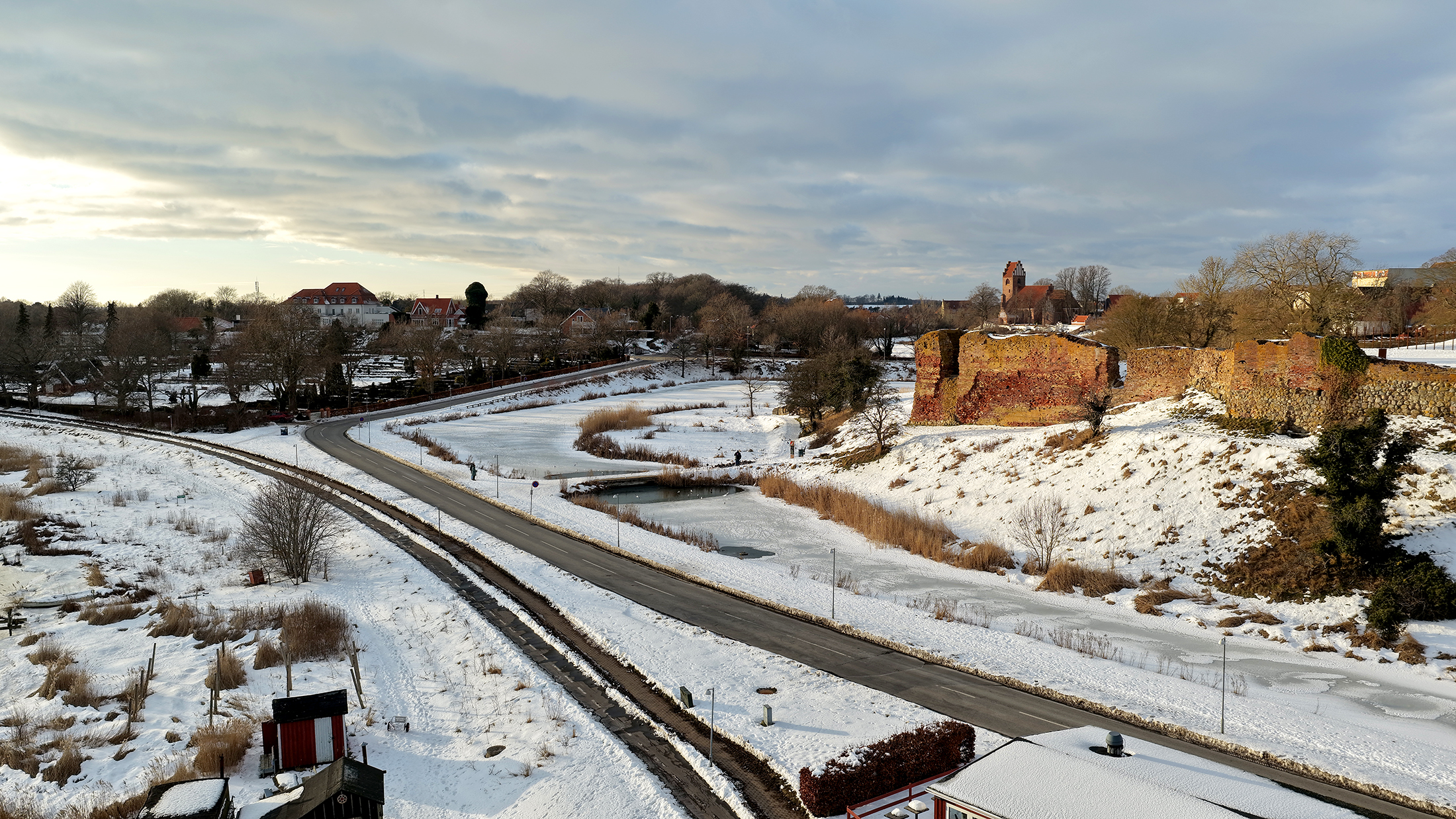 I Vordingborg bymidte skabte kulden et dramatisk udtryk. Tage, torve og små gader var dækket af kompakt sne, og frosten havde bidt sig fast i alle overflader. Set fra dronen blev det tydeligt, hvordan sneen formede byen på ny – bløde linjer oven på de ellers kantede bygninger. Lyset var klart og køligt, og kontrasterne mellem himmel, mursten og sne gav billederne en helt særlig dybde ved solnedgangen.