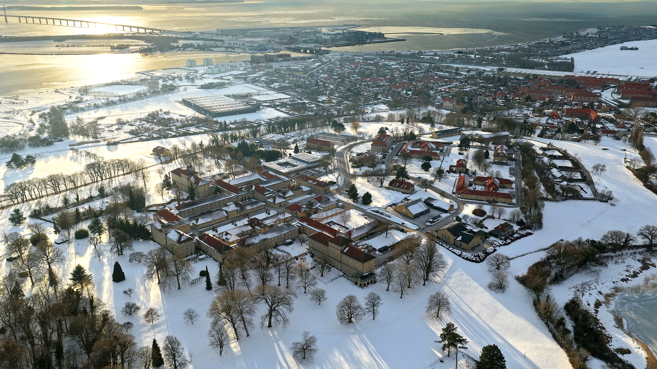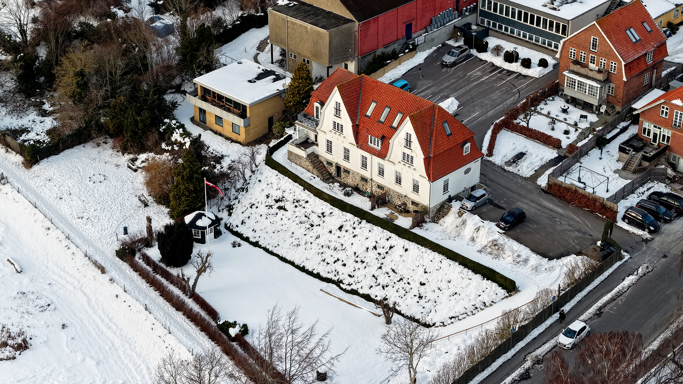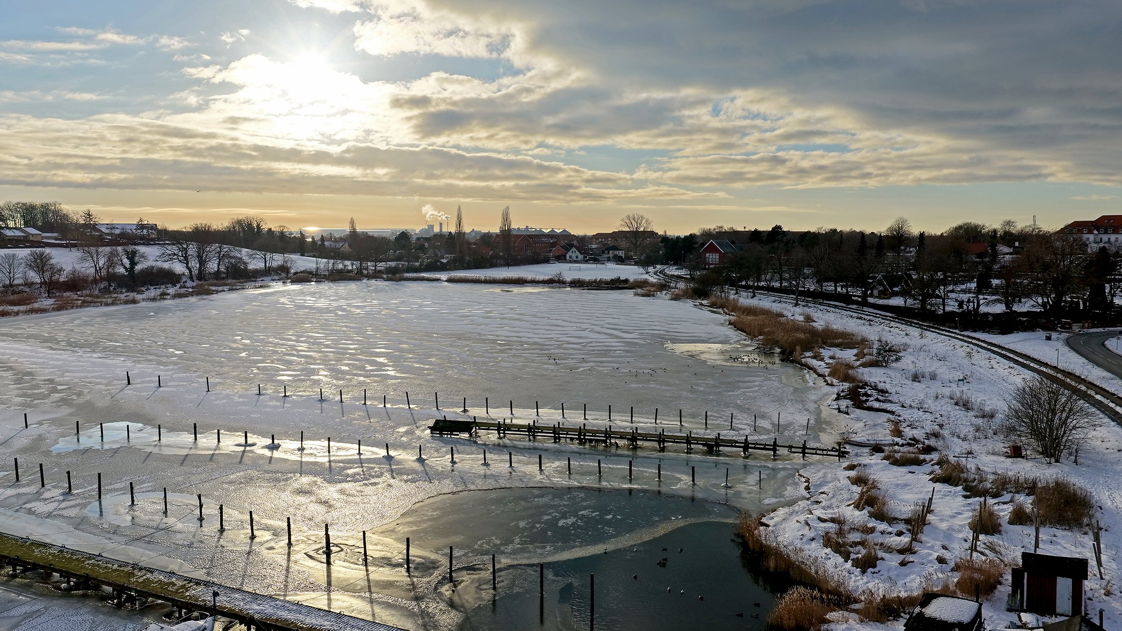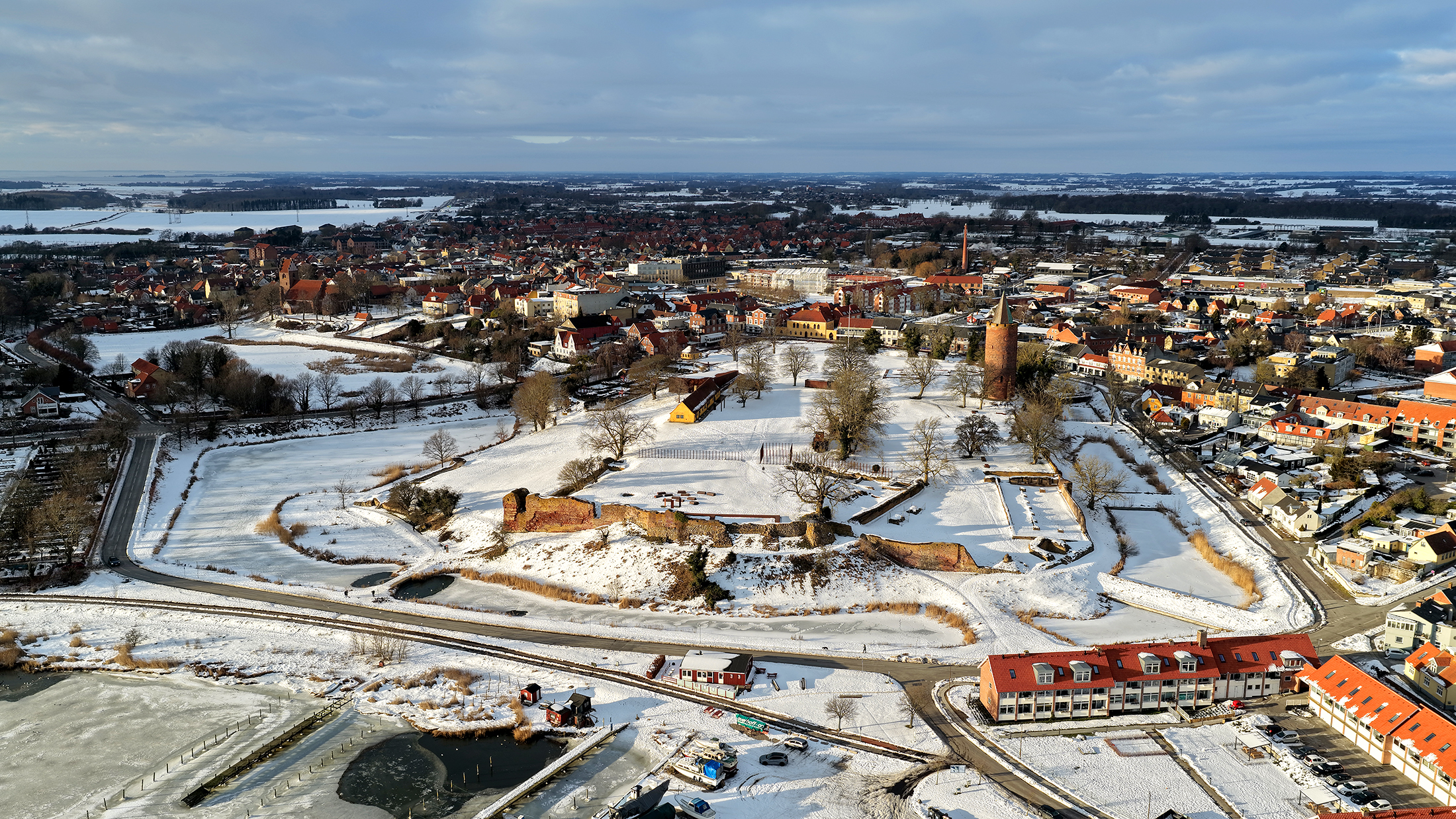 I Vordingborg bymidte skabte kulden et dramatisk udtryk. Tage, torve og små gader var dækket af kompakt sne, og frosten havde bidt sig fast i alle overflader. Set fra dronen blev det tydeligt, hvordan sneen formede byen på ny – bløde linjer oven på de ellers kantede bygninger. Lyset var klart og køligt, og kontrasterne mellem himmel, mursten og sne gav billederne en helt særlig dybde ved solnedgangen.