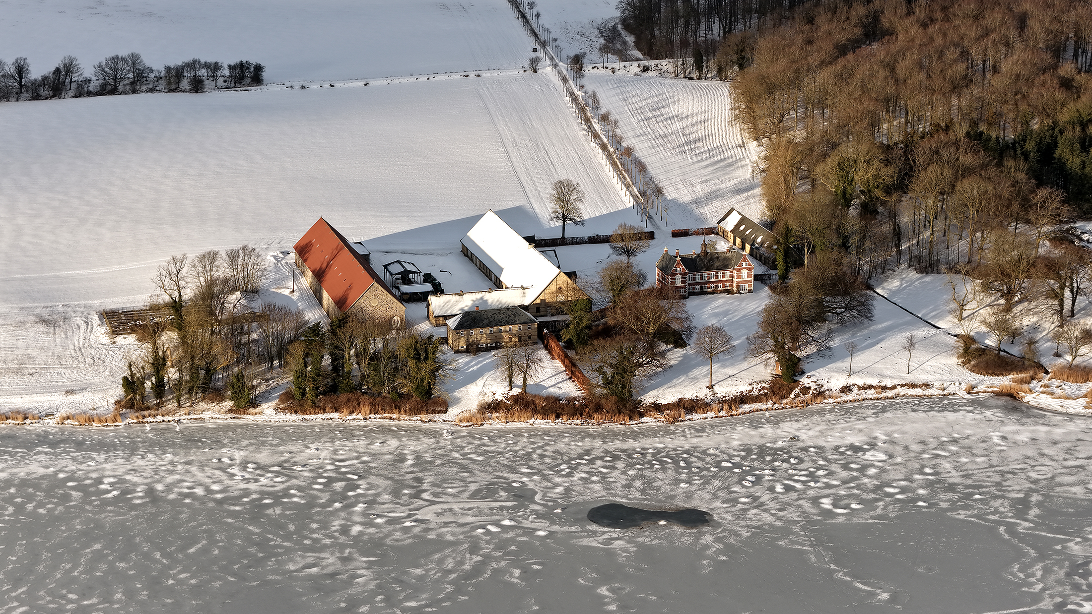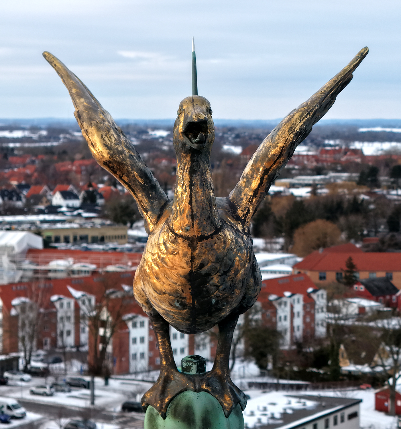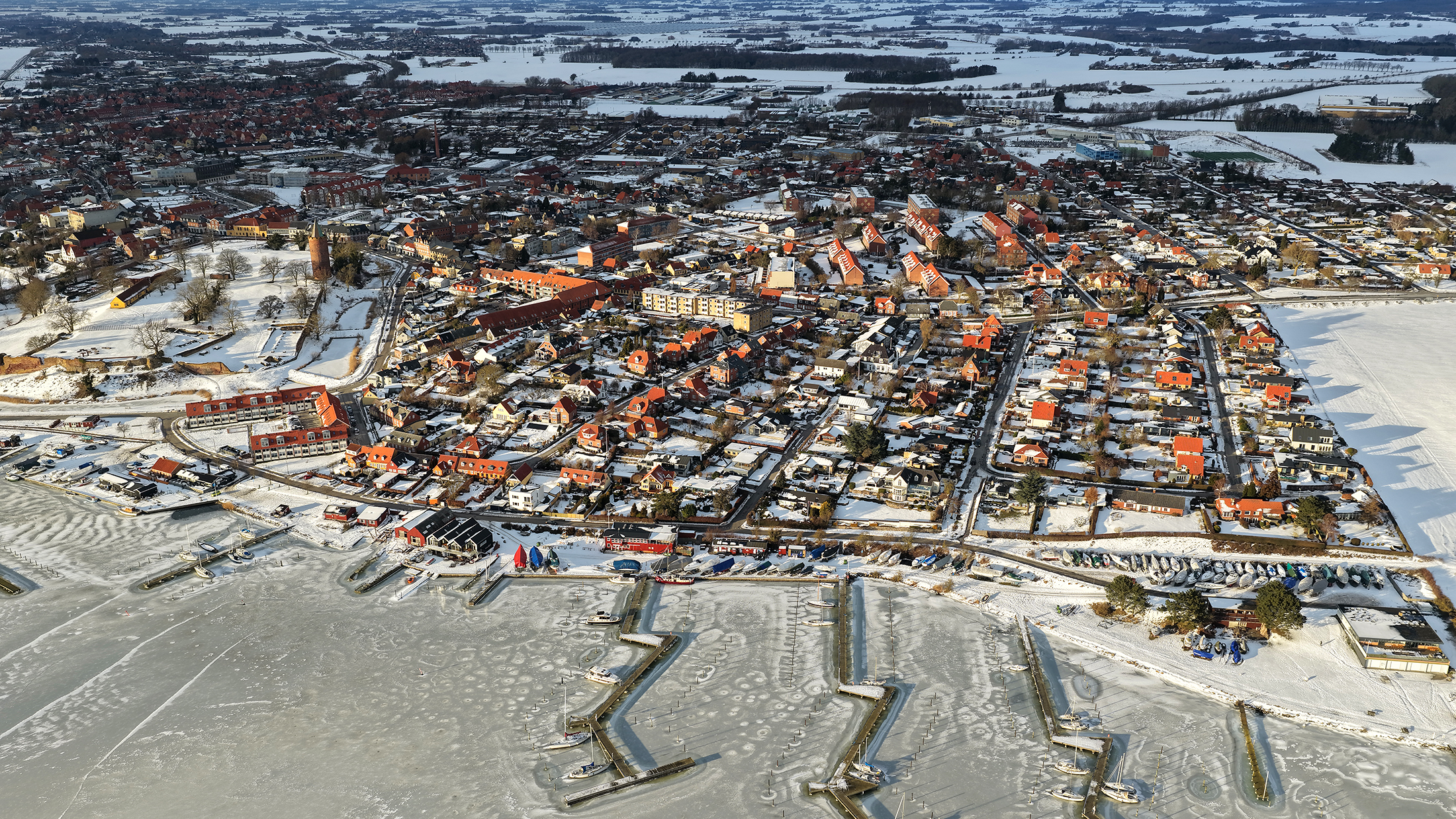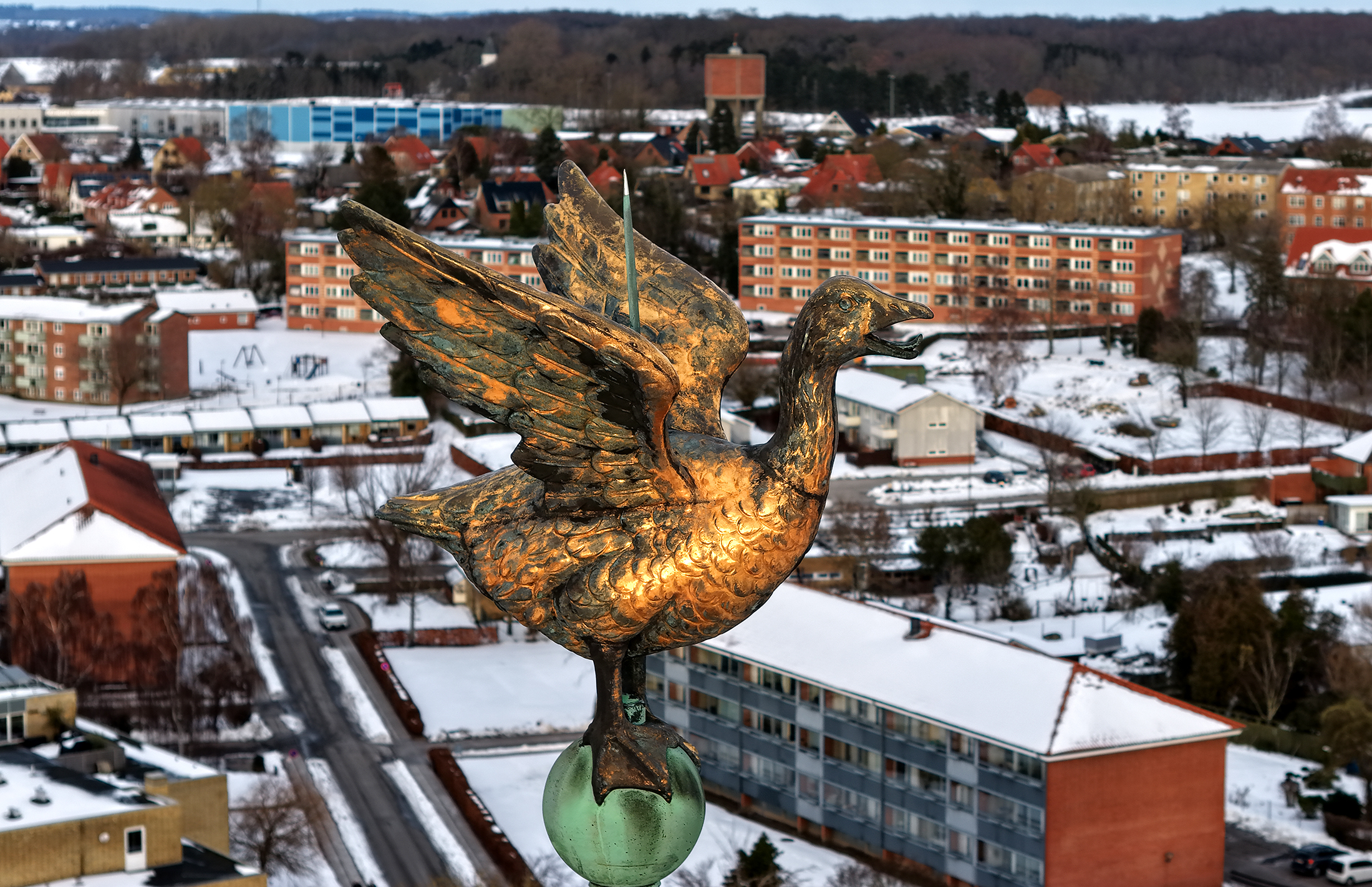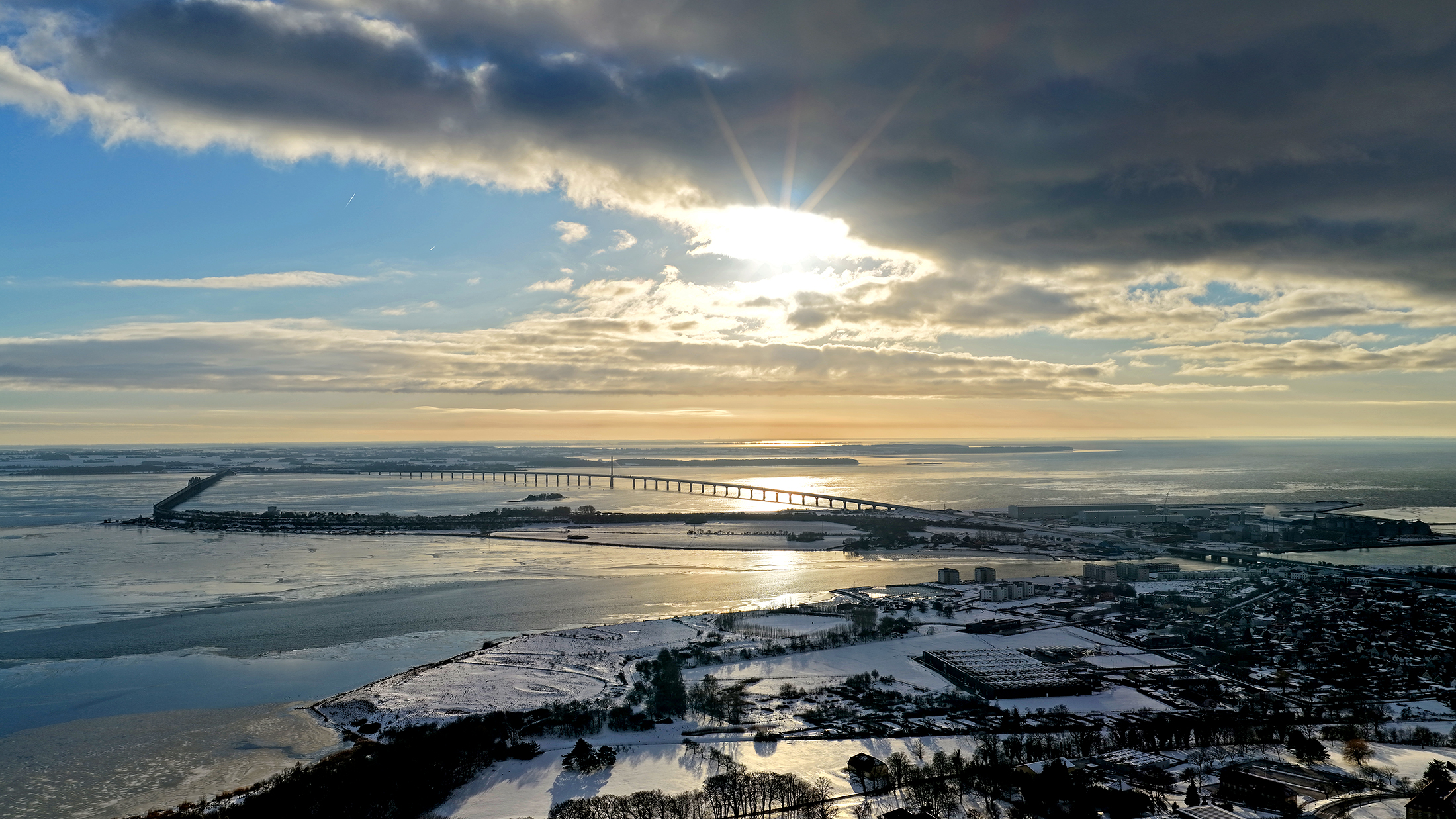 I Vordingborg bymidte skabte kulden et dramatisk udtryk. Tage, torve og små gader var dækket af kompakt sne, og frosten havde bidt sig fast i alle overflader. Set fra dronen blev det tydeligt, hvordan sneen formede byen på ny – bløde linjer oven på de ellers kantede bygninger. Lyset var klart og køligt, og kontrasterne mellem himmel, mursten og sne gav billederne en helt særlig dybde ved solnedgangen.