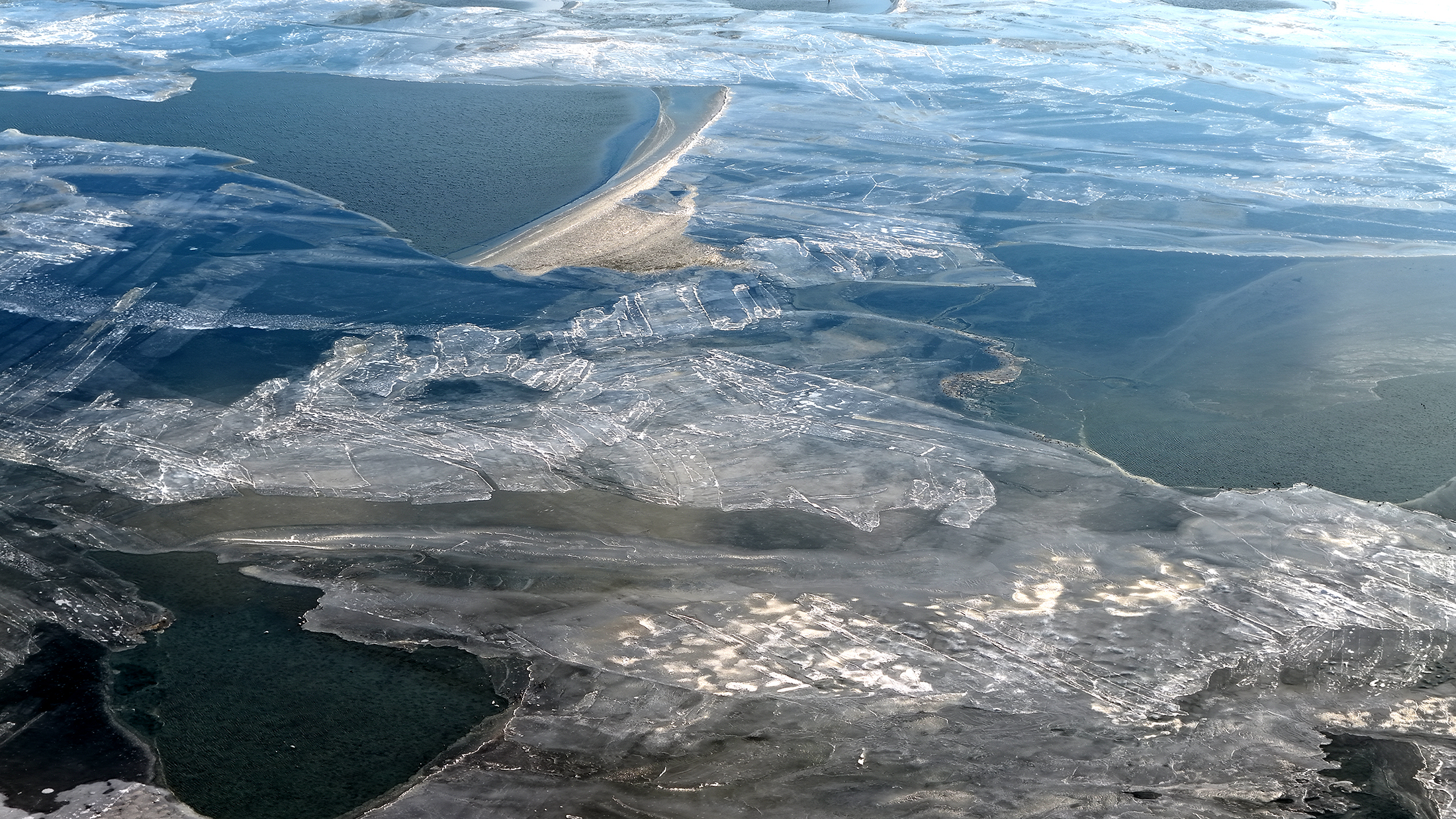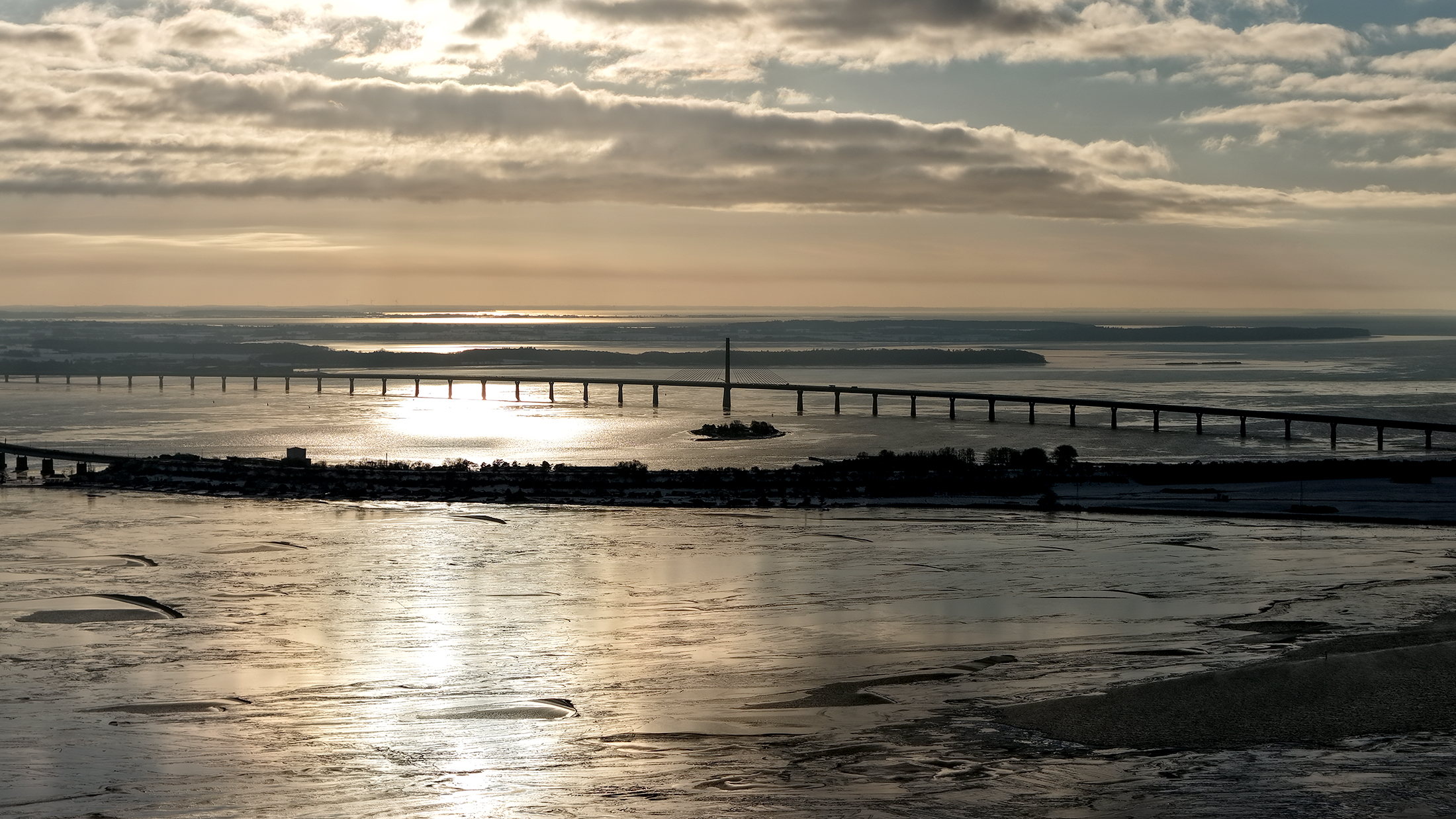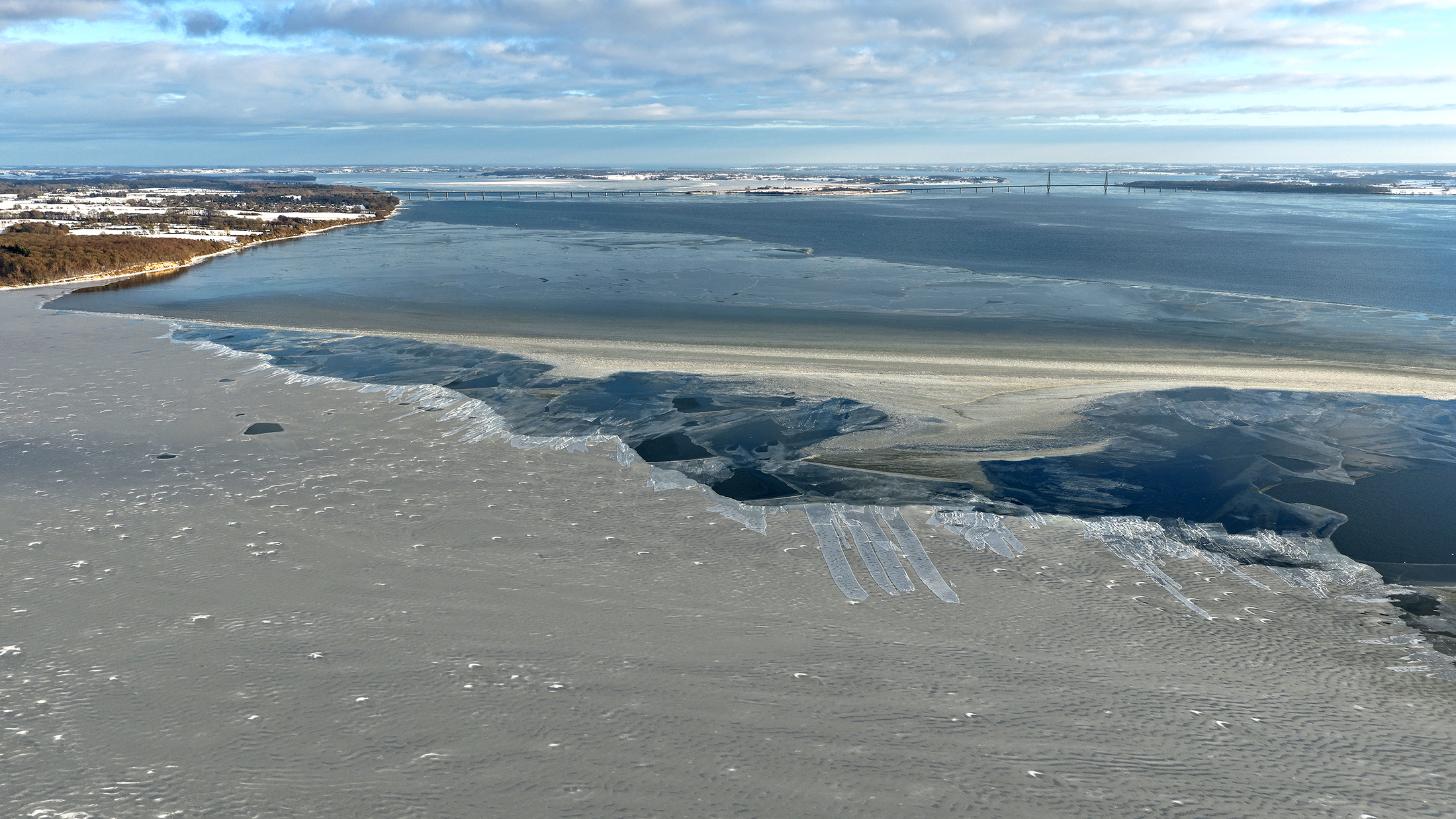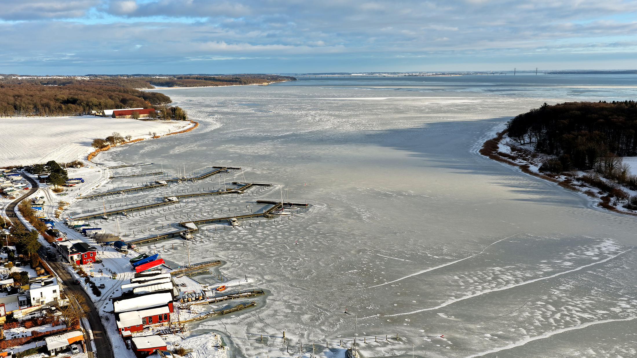 Ved Vordingborg Nordhavn var vinteren endnu mere dramatisk. Ude over vandet lå isen tung og massiv – næsten som et lille ishav. Isflager havde presset sig sammen i formationer, og sneen havde lagt sig i lag ovenpå. Fra oven lignede det et frossent landskab fra en anden verden, hvor naturens kræfter tydeligt havde sat deres præg.
