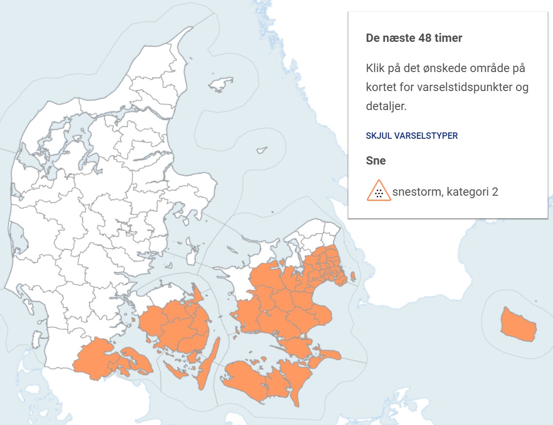 DMI har udsendt varsel om snestorm i den sydlige og østlige del af landet fra mandag morgen til tirsdag morgen. Sydsjælland – herunder Vordingborg Kommune – er blandt de områder, hvor sne og kraftig vind kan give udfordrende forhold.