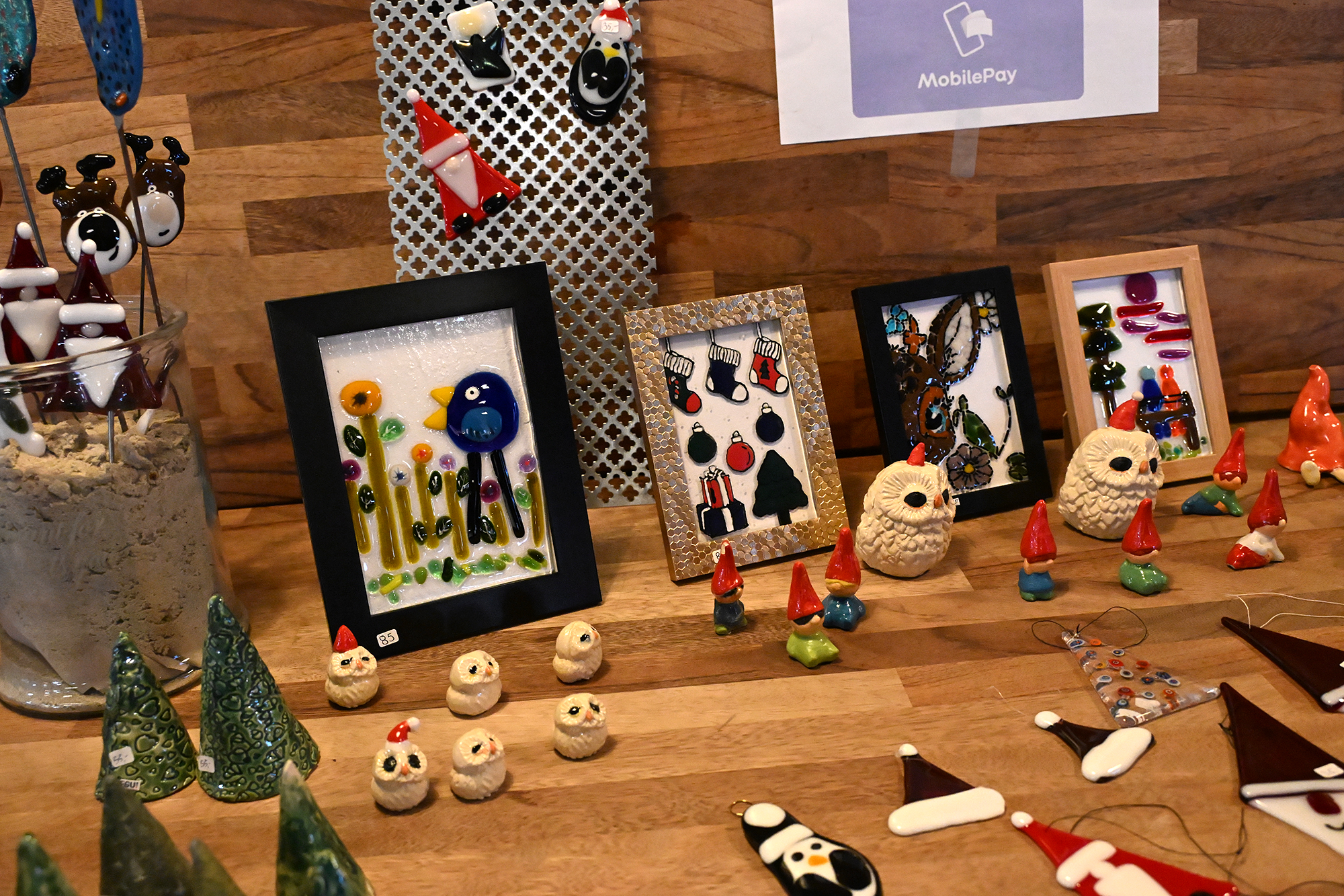 Her var et imponerende udvalg af kreativt håndværk, som viste bredden af de fag, eleverne arbejder med til daglig. På bordene stod smukt glaskunst, der fangede lyset på elegant vis, og ved siden af lå fint udførte træværker – alt fra små skulpturer til dekorative brugsgenstande, lavet med stor præcision og kærlighed til materialet.