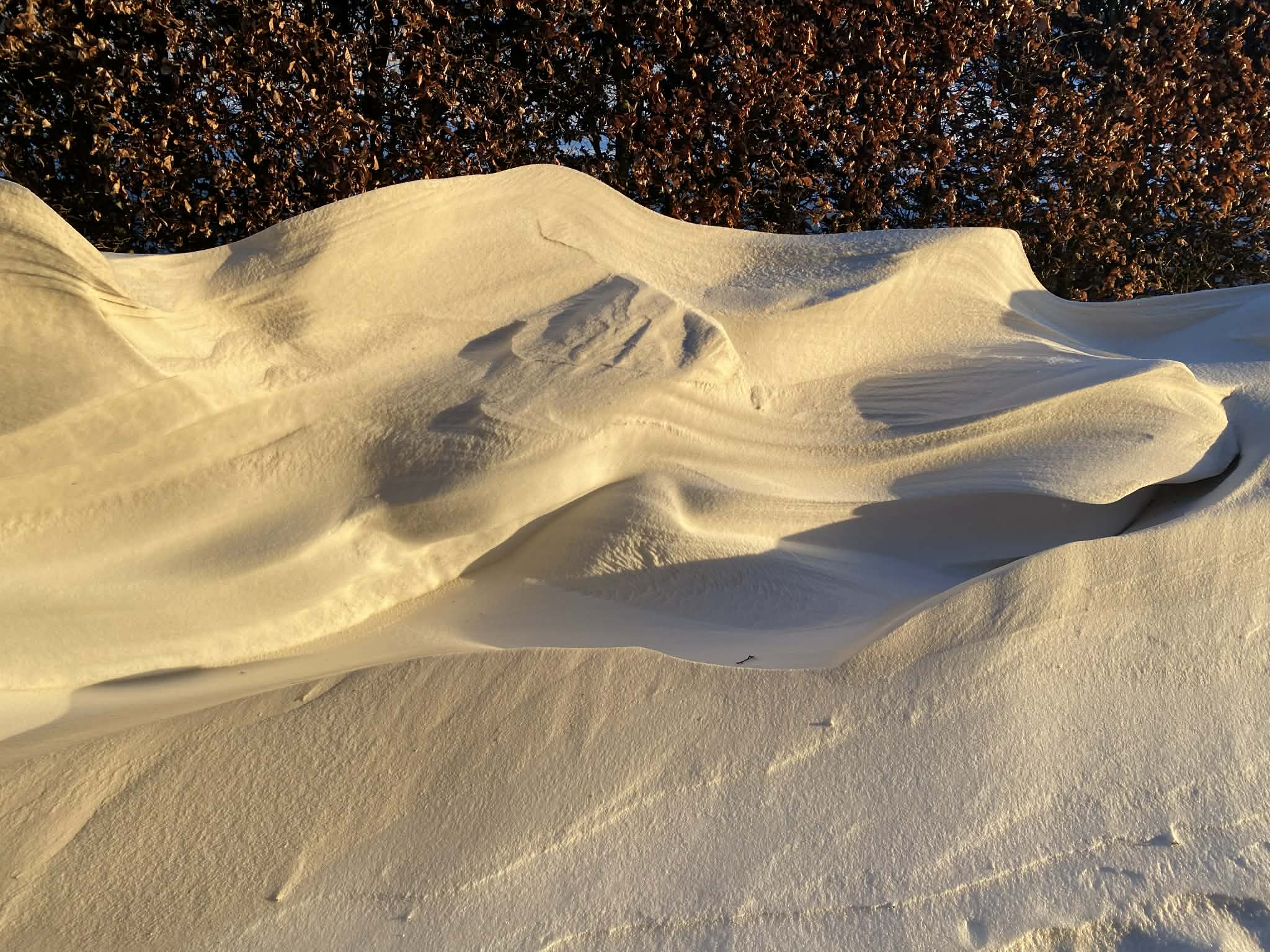 Det er som at træde direkte ind i et eventyrlandskab. De bløde, bølgende former i sneen minder næsten om frosne havbølger, og langs hegn, buske og små forhøjninger har vinden modelleret skulpturer, som kun vinteren kan skabe. Lyset spiller smukt i de hvide flader, især når solen bryder igennem skyerne og får snekrystallerne til at glimte.