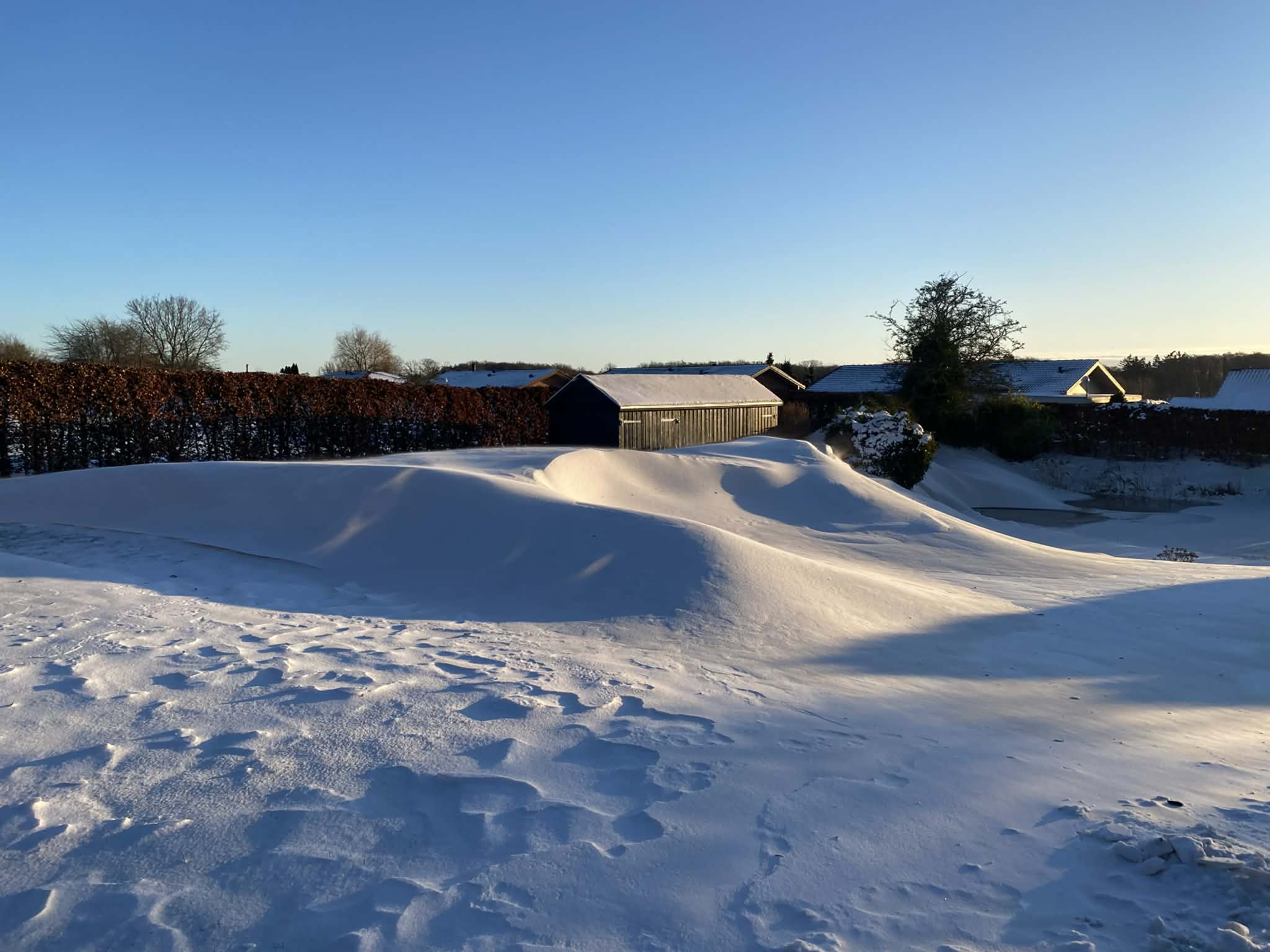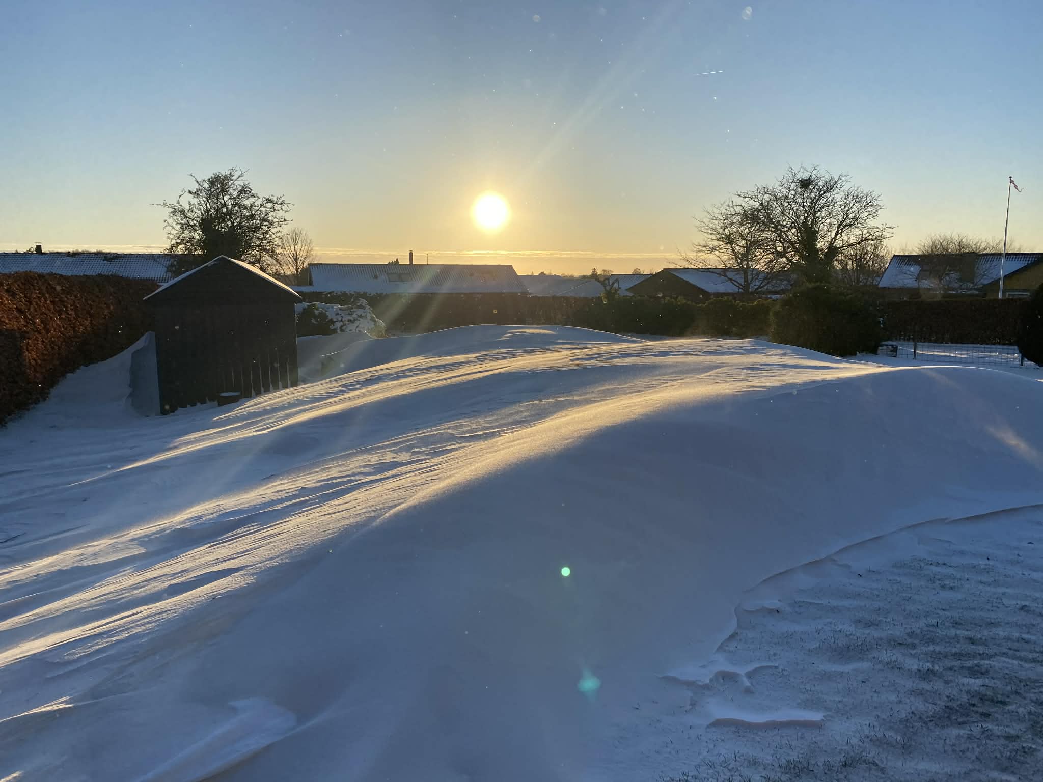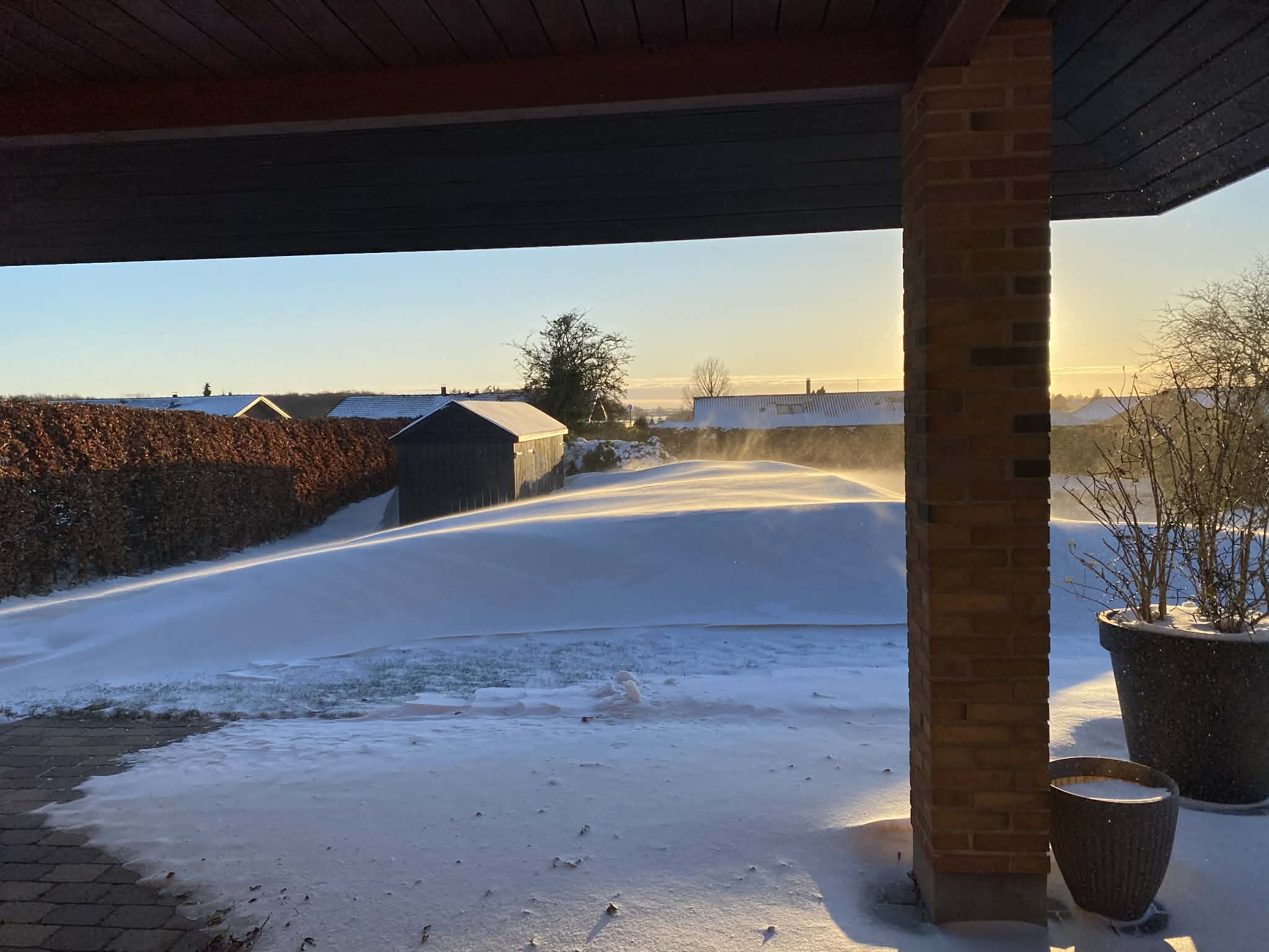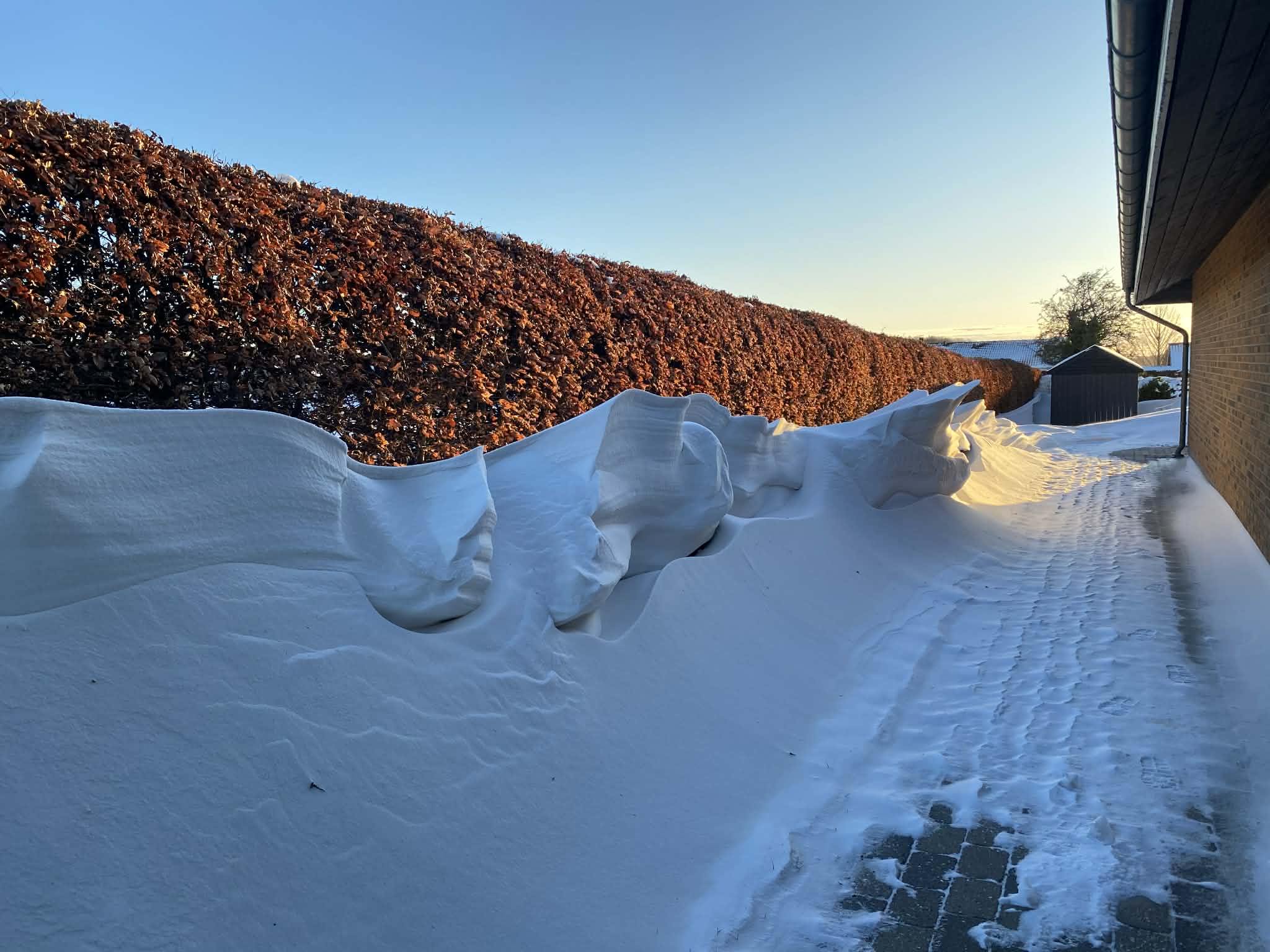 Det seneste stykke tid har naturen virkelig vist sig fra sin smukkeste vinterside her på Askemarksvej. Sneen er faldet i rolige lag, mens vinden fra nordøst har blæst hen over markerne og skabt de mest imponerende snefyninger og formationer i vores baghave.
