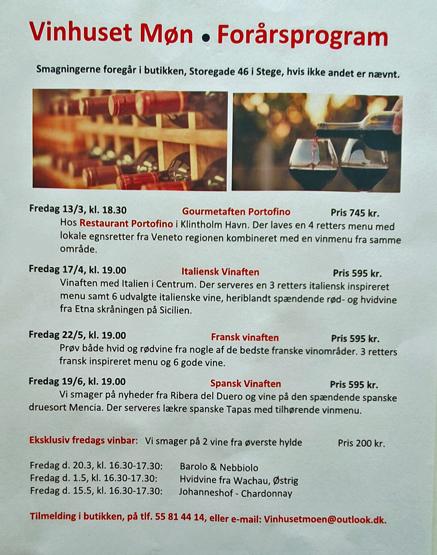 Annonce: Vinhuset Møn i Stege har i deres forårsprogram en række spændende smagninger hvor der også indgår tilpassede menuer.
