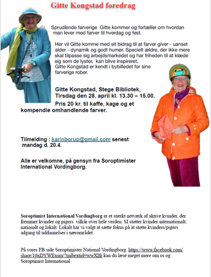 Mødet arrangeres af Soroptimist International Vordingborg, som er et netværk af kvinder,der fremmer kvinders og pigers vilkår over hele verden. SI støtter kvinder internationalt, nationalt og lokalt.