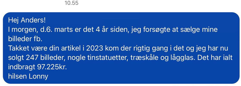 Lonny har nu solgt 247 billeder, nogle tinstatuetter, træskåle og lågglas. Det har indbragt 97.225 kr som er gået til at støtte Ukraine i krigen mod Rusland.