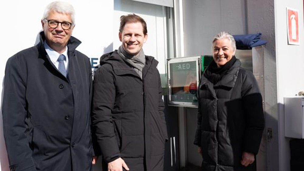 Alle 280 hjertestartere i forskningsprojektet NordStart er nu sat op rundt om i Region Nordjylland. Her er Melsen Fondens formand, Anker Laden-Andersen (tv.), regionsrådsformand Mads Duedahl (V) og Hjerteforeningens adm. direktør, Anne Kaltoft, ved opsætningen af projektets første hjertestarter i Sæby i foråret 2023. Hjerteforeningen