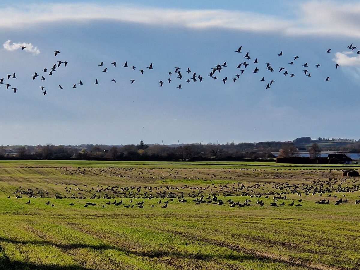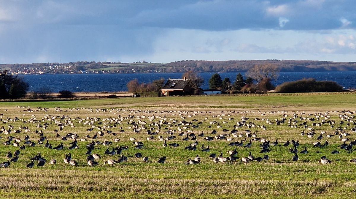 Nogle gange ses de enorme gåseflokke ganske tæt på landevejen – andre gange vælger de mere kystnære arealer. Der kan være gæs så langt øjet rækker.