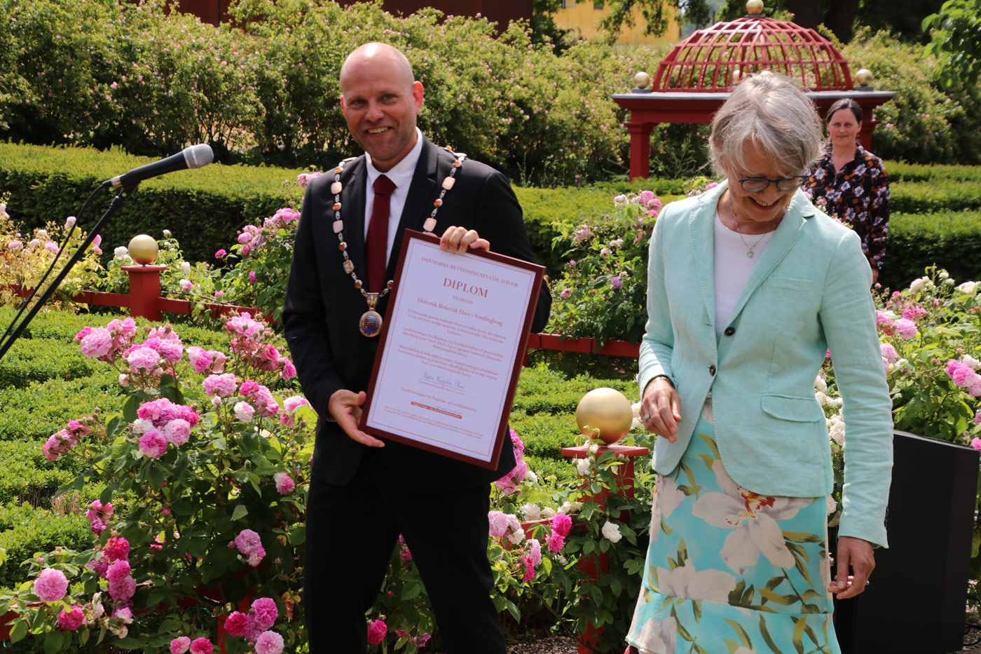 Derefter var der tale fra formanden for Landsforeningen for bygnings- og landskabskultur Karen-Margrethe Olsen som samtidig overrakte et diplom til borgmesteren for Danmarks Betydningsfulde Haver.