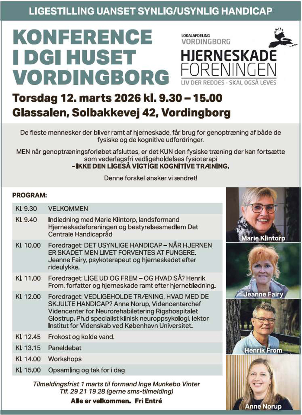 Konference Ligestilling Uanset Synlige/Usynlige handicap 12 marts DGI huset Vordingborg 8.30-15.00. Alle er velkommen. Tilmeldings