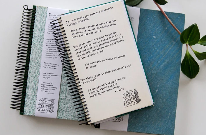 One More Story er et bæredygtigt koncept, hvor gamle, kasserede bøger bruges til notesbøger, interiørdesign, kunst og som brugskunst. Alt bliver håndlavet af Julie, som står bag One More Story. Siderne i notesbøgerne er enten lavet af Cradle to Cradle-certificeret genbrugspapir eller stammer fra sider fra kasserede bøger.