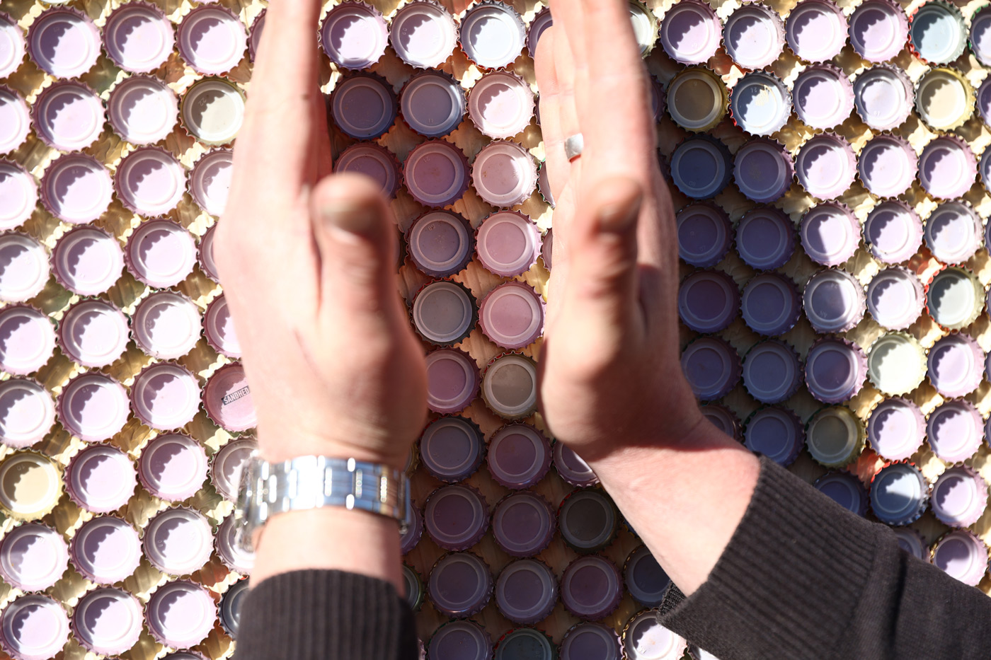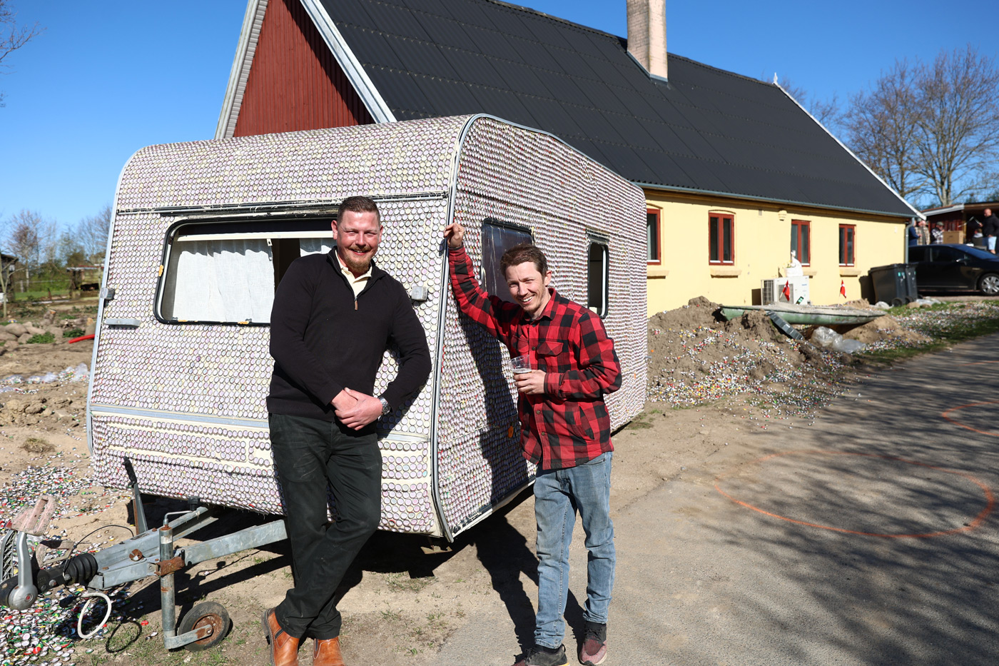 En gammel ramponeret campingvogn var udsmykket, fuldstændig dækket, af kapsler. -Det tog lang tid, mange timer, hver eneste kapsel er limet fast, lød det fra Mikkel Larsen.