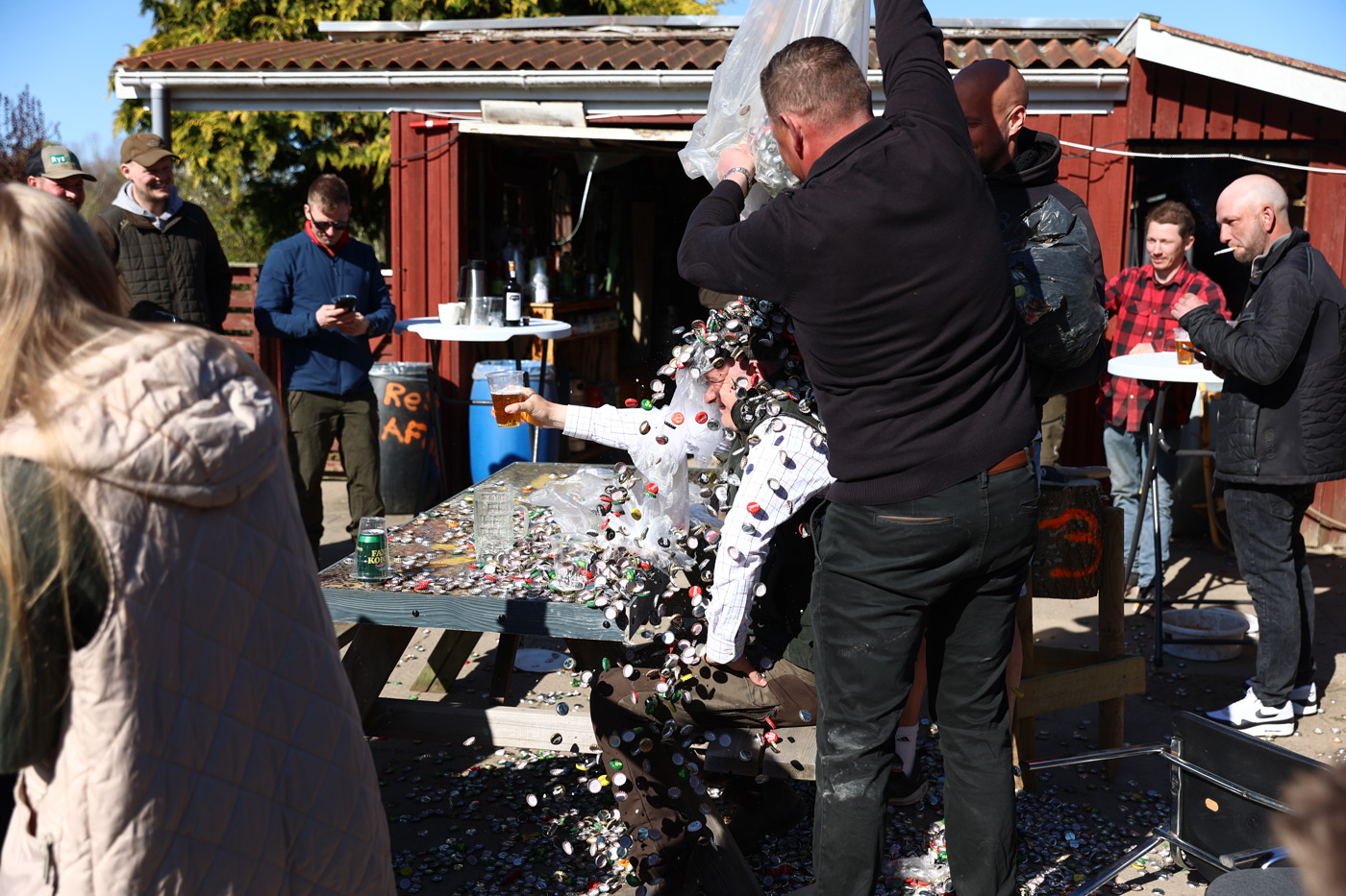 Pludselig, medens fødselaren Mads Nielsen modtog en gave, blev han overhældt med kapsler. -Pay back, blev der grinet.