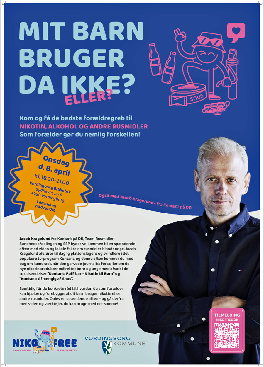 Vordingborg Kommune inviterer til spændende forældreaften d. 8. april om nikotin, alkohol og andre rusmidler med journalist Jakob Kragelund (kendt fra DR Kontant) og eksperter fra sundhedsområdet, Team Rusmidler og SSP.