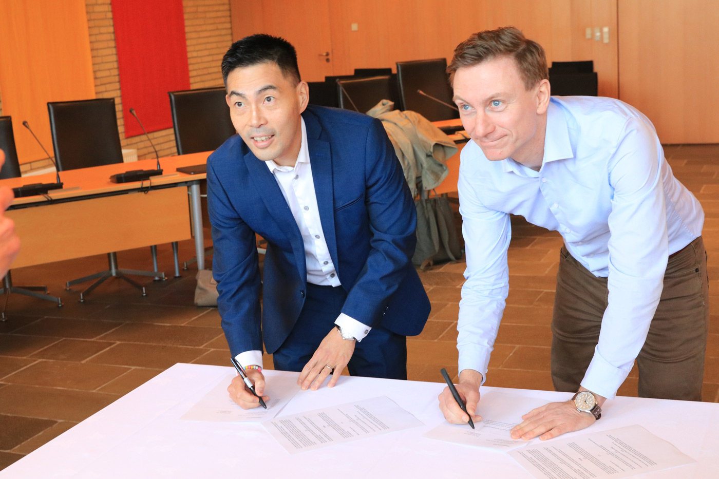 Peter Søgaard fra Innovater A/S og Mads Young, direktør i Vordingborg Kommune, skriver under på aftalen. Foto Anders Munch.