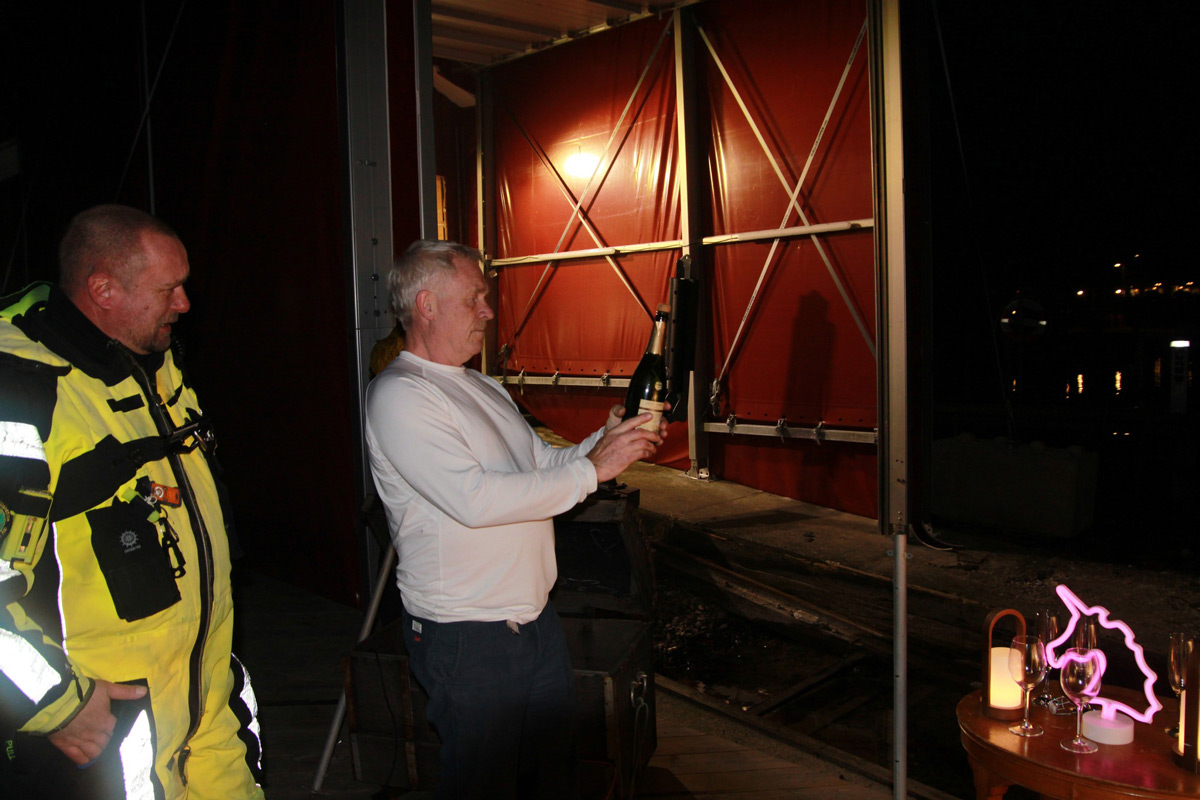 Helt uventet var der en modtageceremoni da de ankom til Klintholm Havn. Indehaver af Klap Hesten, Ole Eskling, havde arrangere bobler som velkomst. -Det var uventet men hyggeligt, fortæller Dennis Jørgensen.