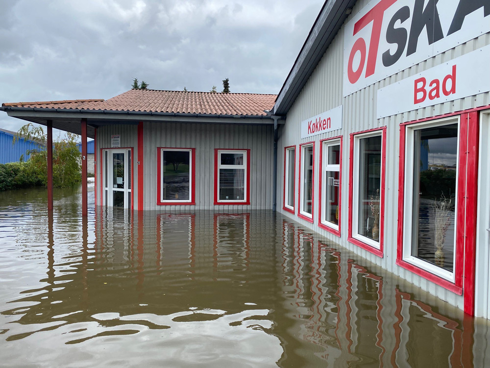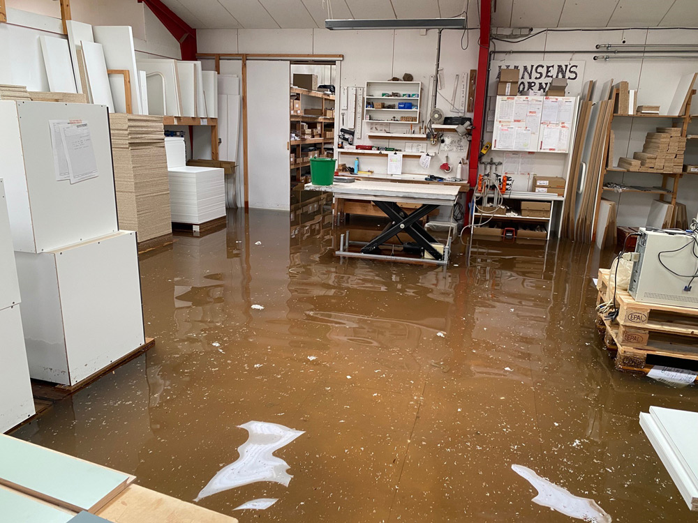 OT Skabe og Jysk sengetøjslager ser ud til at være hårdest ramt efter tirsdagens skybrud, og selv efter et døgn stod vandet stadig højt. Ole Trommer, der ejer køkkenvirksomheden, udtaler at han aldrig i de 30 år fabrikken har eksisteret, har oplevet noget lignende. Kloak systemet er simpelthen ikke gearet til så meget vand på en gang udtaler han, og selv i sin vildeste drøm, har han ikke tænkt på, at sådan noget kunne ske. Fabrikken er totalt ødelagt og det her vil tage lang tid at genetablere siger Ole. Maskinernes ædlere dele sidder heldigvis højt, så de vil sandsynligvis ikke have taget væsentlig skade, men kabler mm. ligger under gulvet og meget af produktionen + alle vores udstillings køkkener er ødelagt. Lige nu er der rigtig mange ubekendte, der kører rundt i mit hoved, for først skal forsikringen vurdere skaderne, og hvad så med kunderne, hvor tid jo som hovedregel er en afgørende faktor.