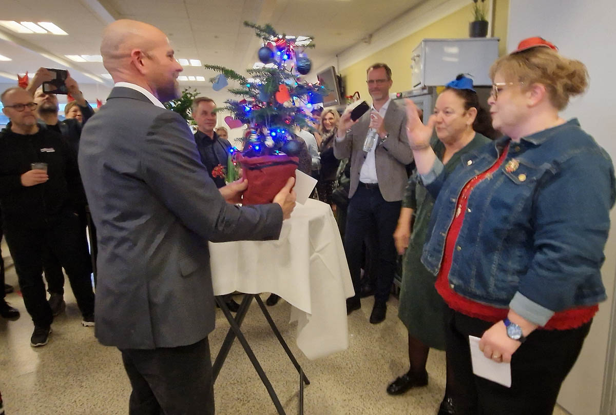 Afgående borgmester Mikael Smed fik et juletræ pyntet med røde og blå kugler af  1. og 2. viceborgmester. En trio, der har haft et godt samarbejde.