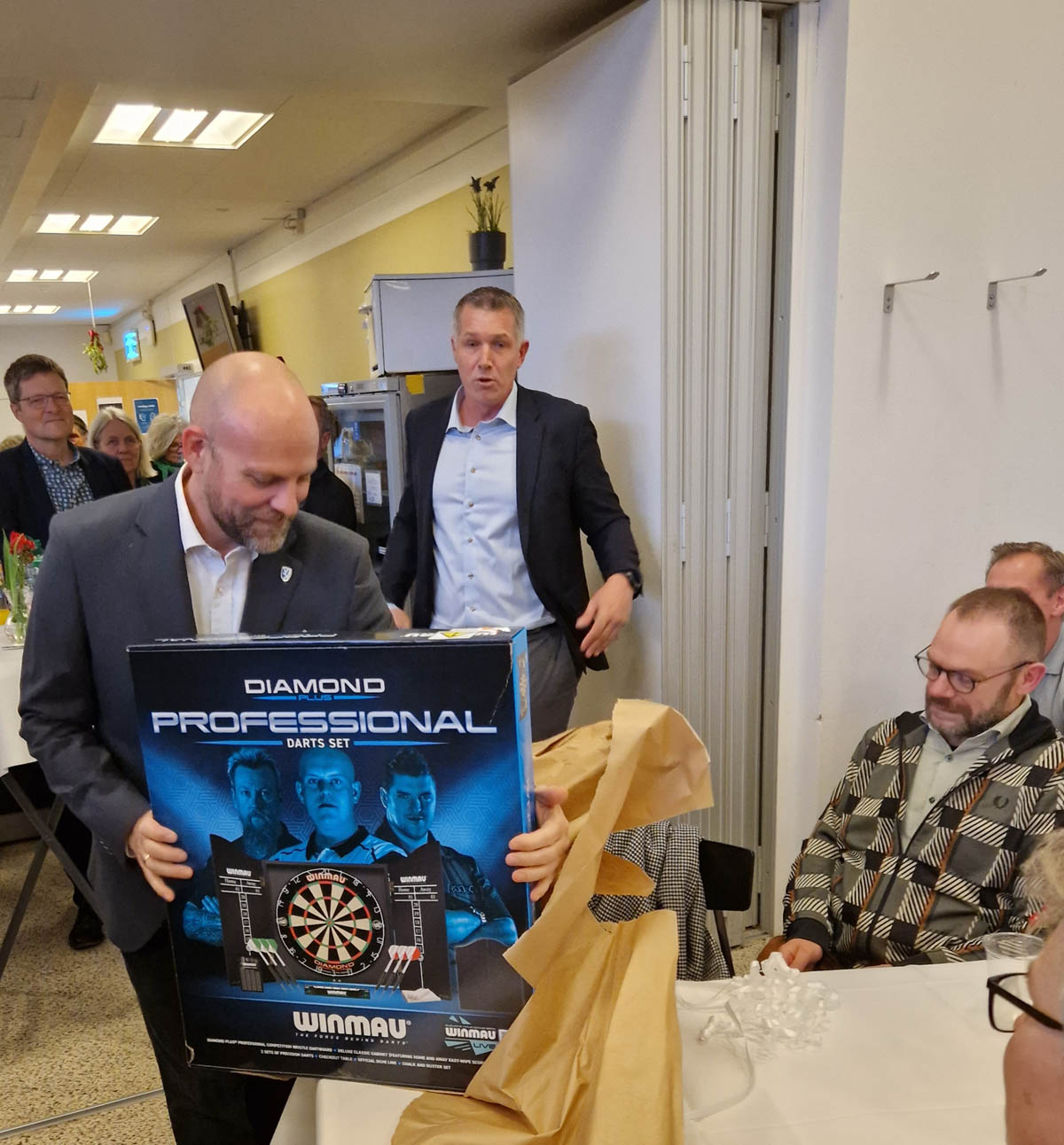 Mikael Smed modtager et dartspil med et sæt røde og blå pile