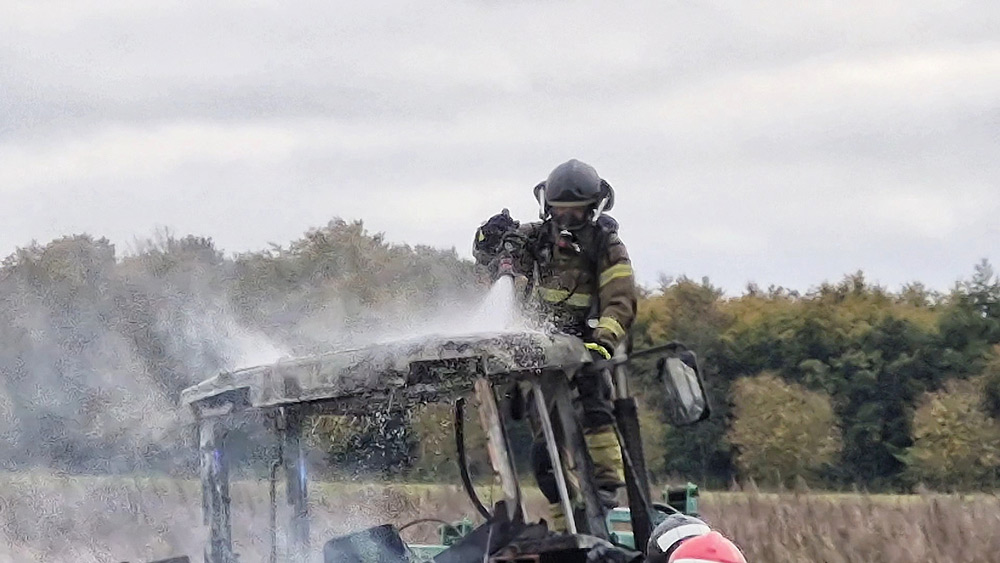 Ved brandvæsnets ankomst var traktoren fuldstændig overtændt, og ilden havde bredt sig til det omkringliggende område ved traktoren.