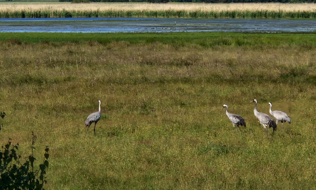 Et sådan syn kan fx opleves på Bøtø på Sydfalster, hvor flere tranepar har bygget rede og fået unger.