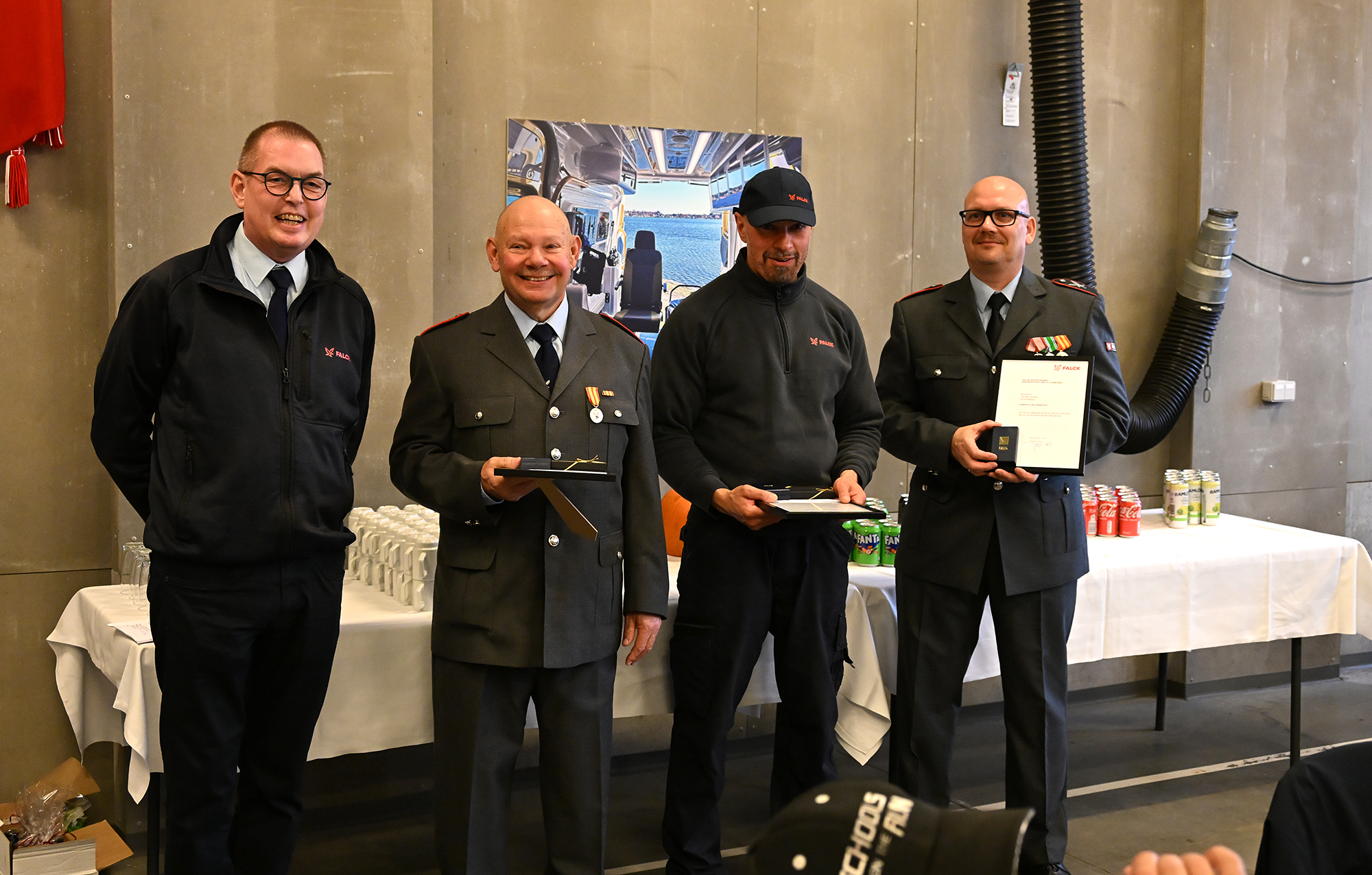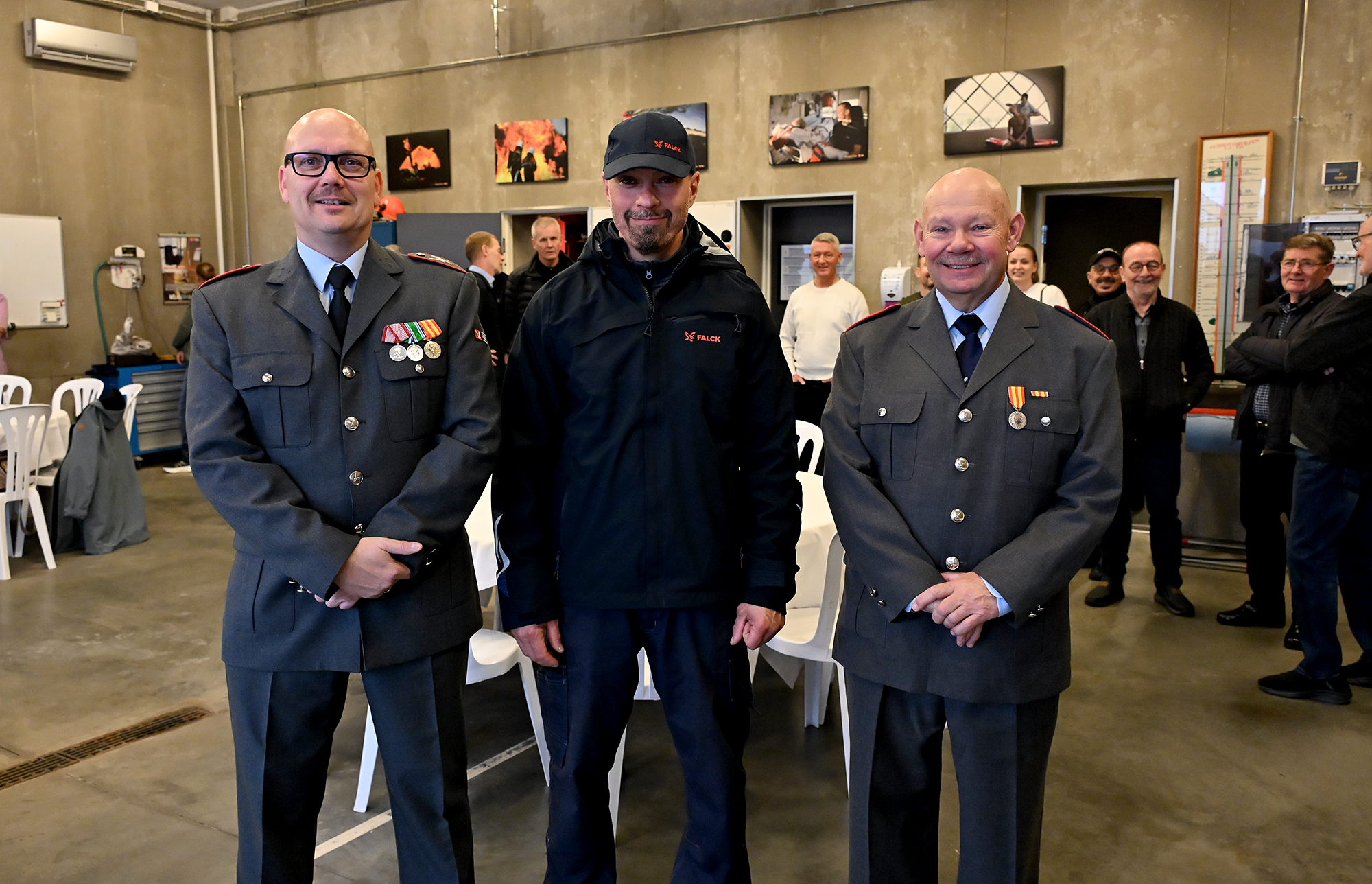 Stationsleder Morten Hemmingsen holdt en varm og personlig tale for hver enkelt af de tre brandmænd. Med både humor og gode anekdoter fra et langt arbejdsliv i uniform fik han sat ord på det kollegiale sammenhold og den særlige ånd, der præger hverdagen i Falck.