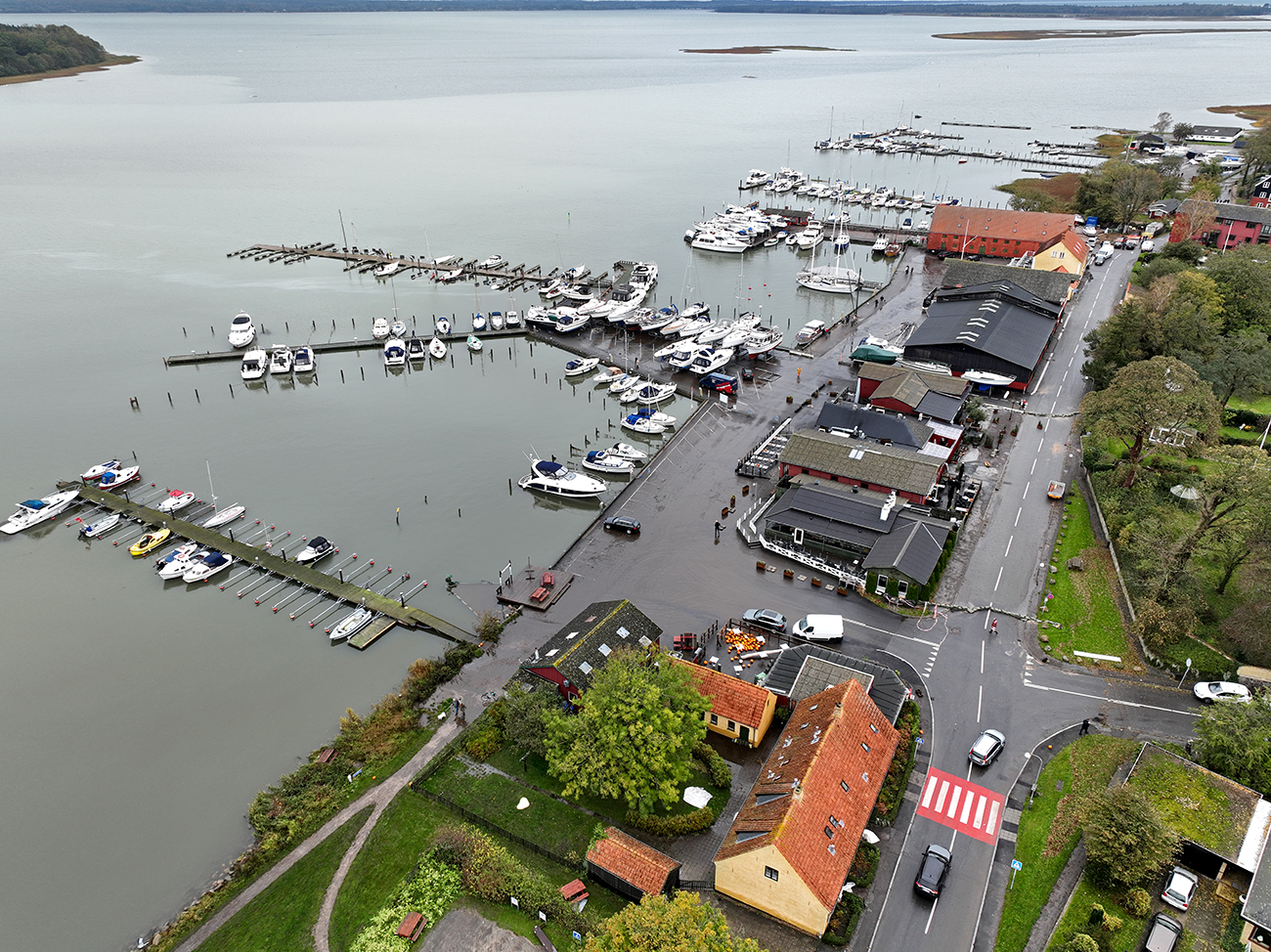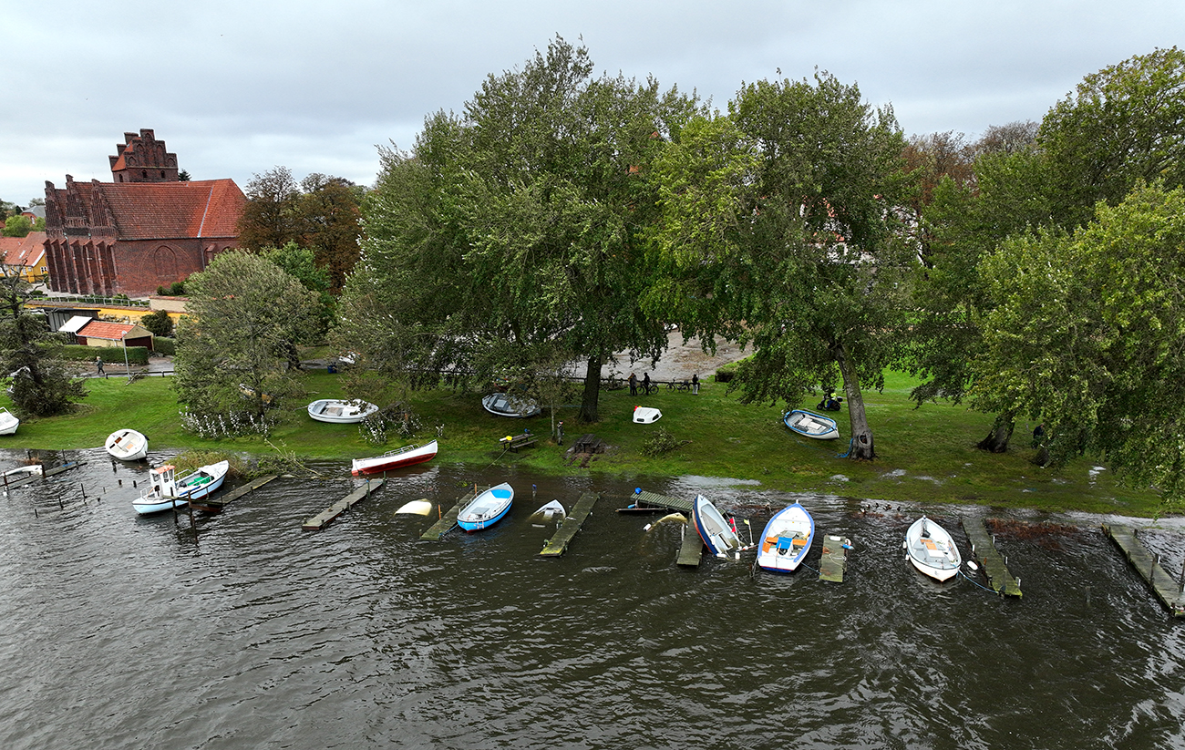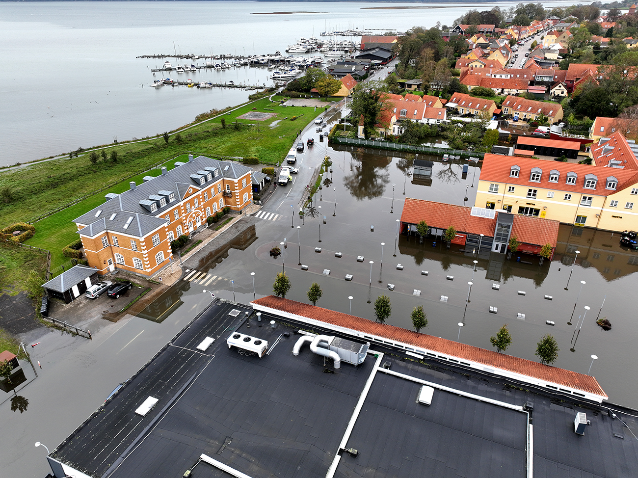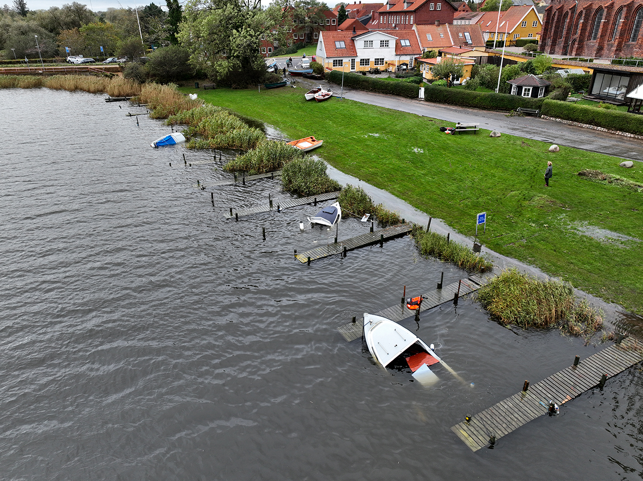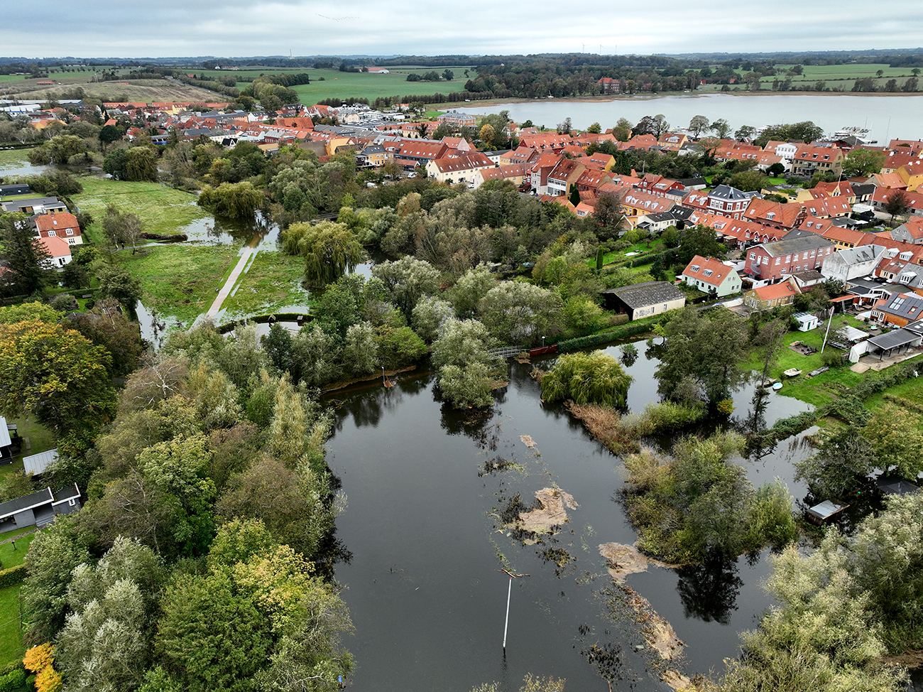 Dronen svævede over Præstø og fangede de oversvømmede gader, de opskyllede både på Nysøvej og torvet, der stod som et stille spejl over byens kamp for at komme sig.