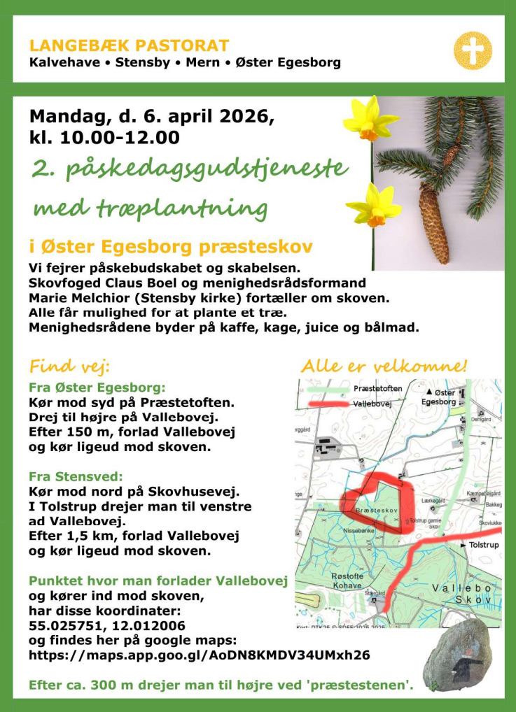 Invitation: Langebæk Pastorat – Øster Egesborg, Mern, Kalvehave og Stensby kirker – inviterer til gudstjeneste mandag den 6. april kl. 10 i Øster Egesborg præsteskov. Ved gudstjenesten vil sognepræst Jeanette Normann Henriksø gøre opmærksom på Påskens budskab; på den kristne fortælling om håb, tilgivelse og evigt liv. En fortælling, der følges op med en hyldest til skaberværket ved at plante træer i pastoratets skov efterfølgende selve gudstjenesten.
