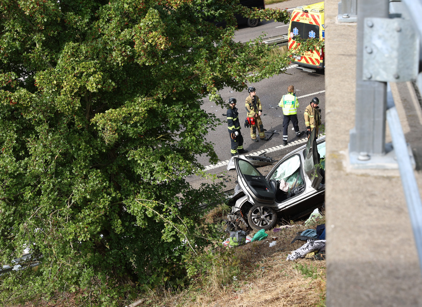 Voldsom ulykke. 4 ambulancer, to helikoptere. Bil torpederede motorvejsbro.
